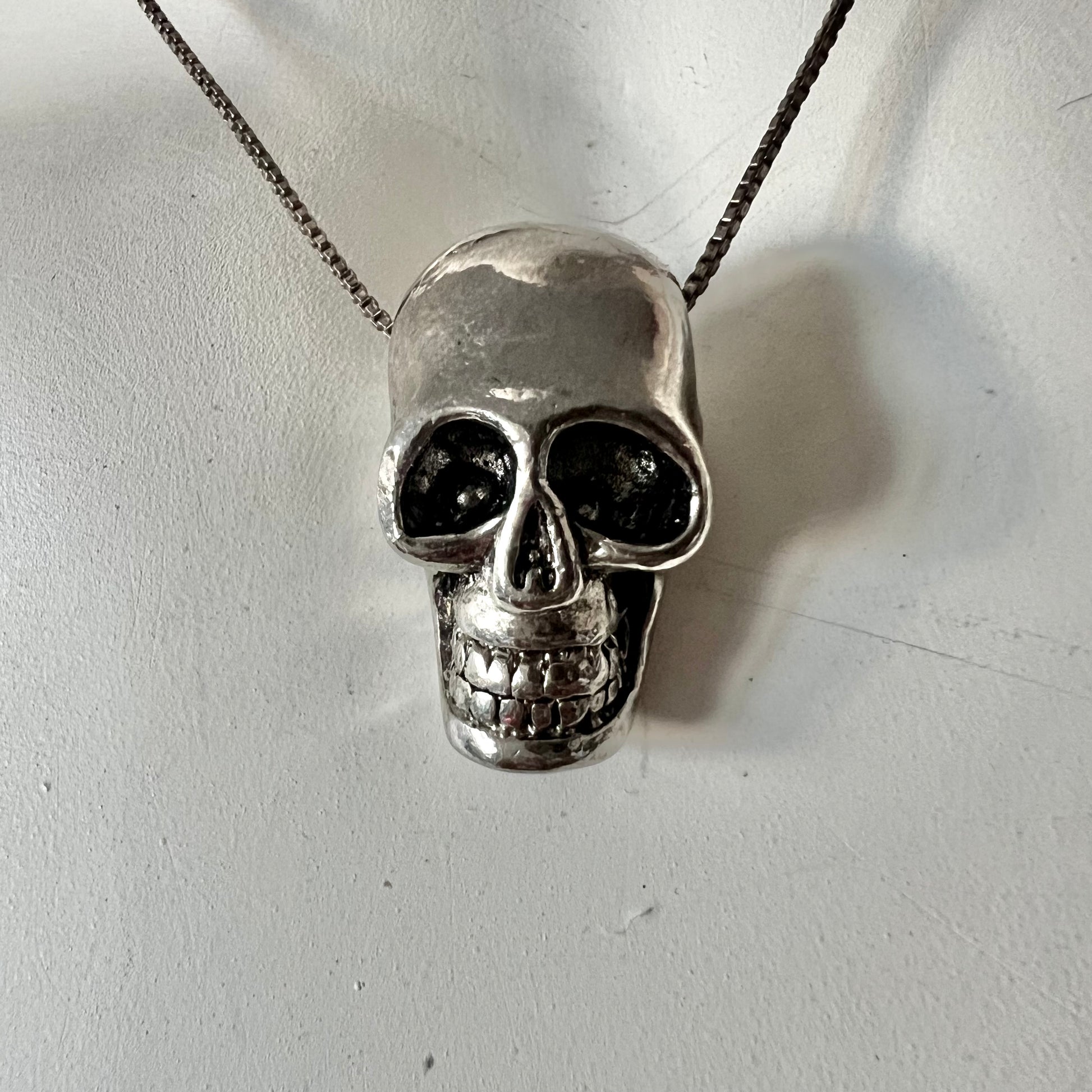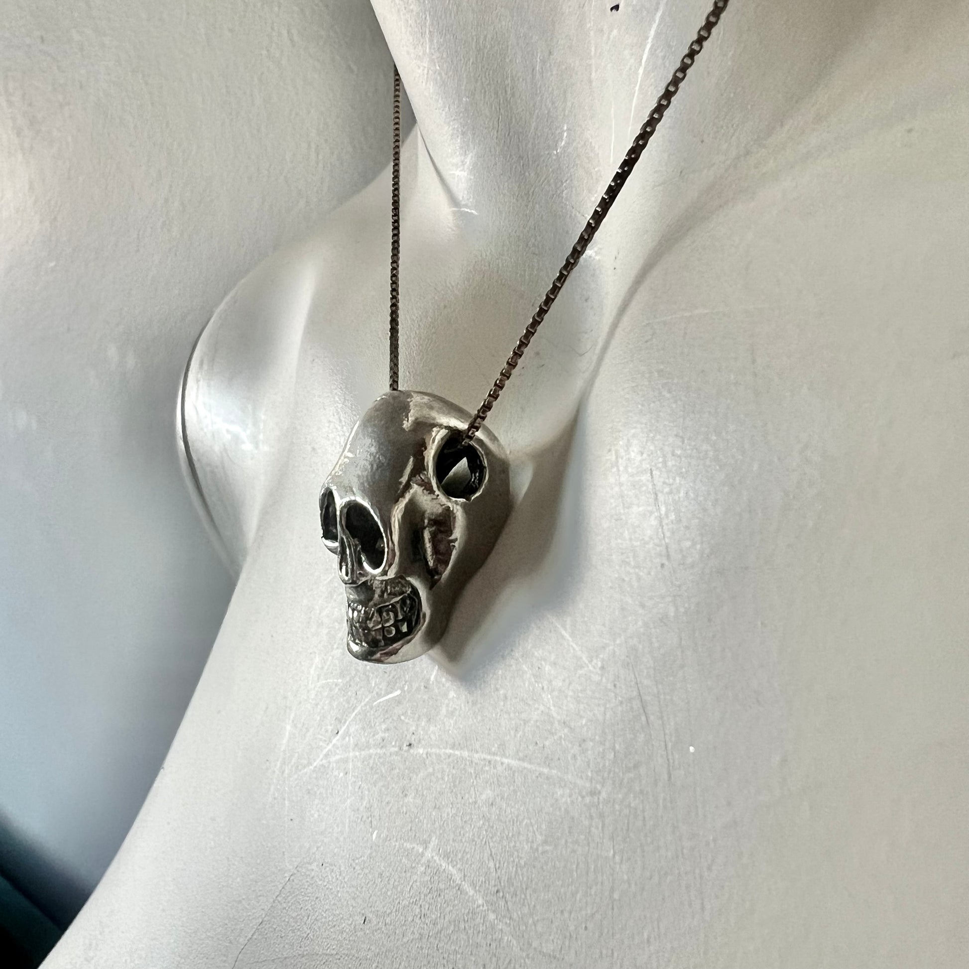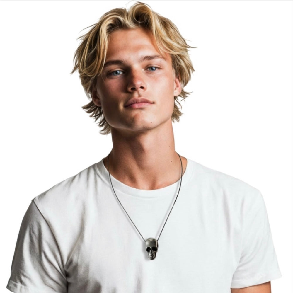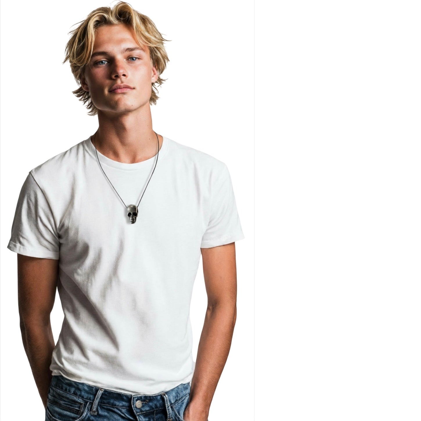 Edgy and stylish, this silver skull pendant necklace adds a bold statement to any outfit. Perfect for those who love unique jewelry pieces.