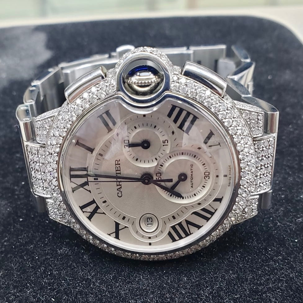 • Case: Stainless Steel set with Custom Diamonds, hallmarked ‘Cartier’ and stamped ‘Automatic’, ‘Water Resistant ', 'Stainless Steel’, ‘Swiss Made’, ‘3109’ and Serial Number.