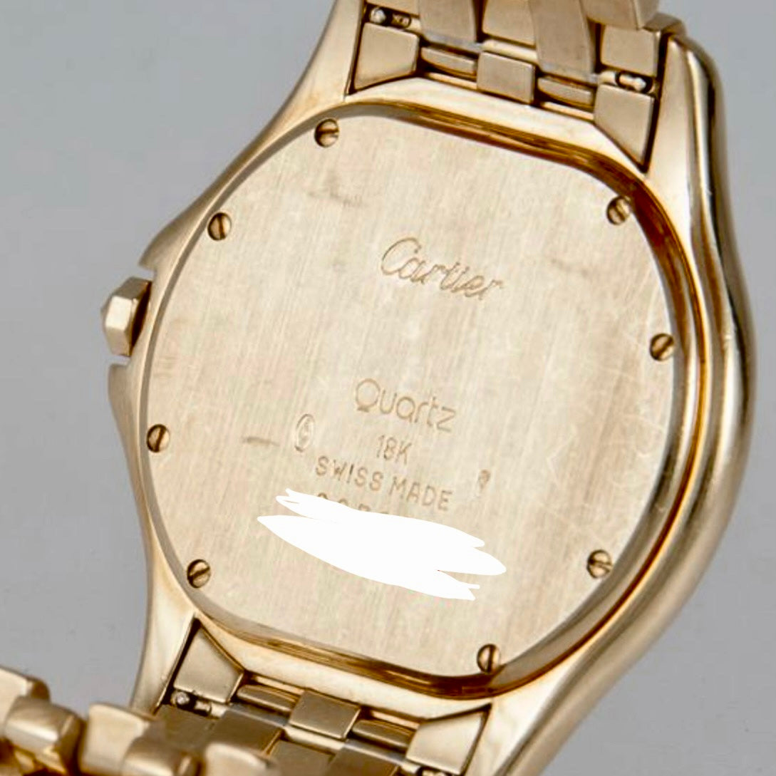 • Case: Glossy 18K Yellow Gold set with Custom Natural Diamonds hallmarked ‘Cartier’ and stamped ‘Quartz’, ‘18K’, ‘Swiss Made’ and Serial Number