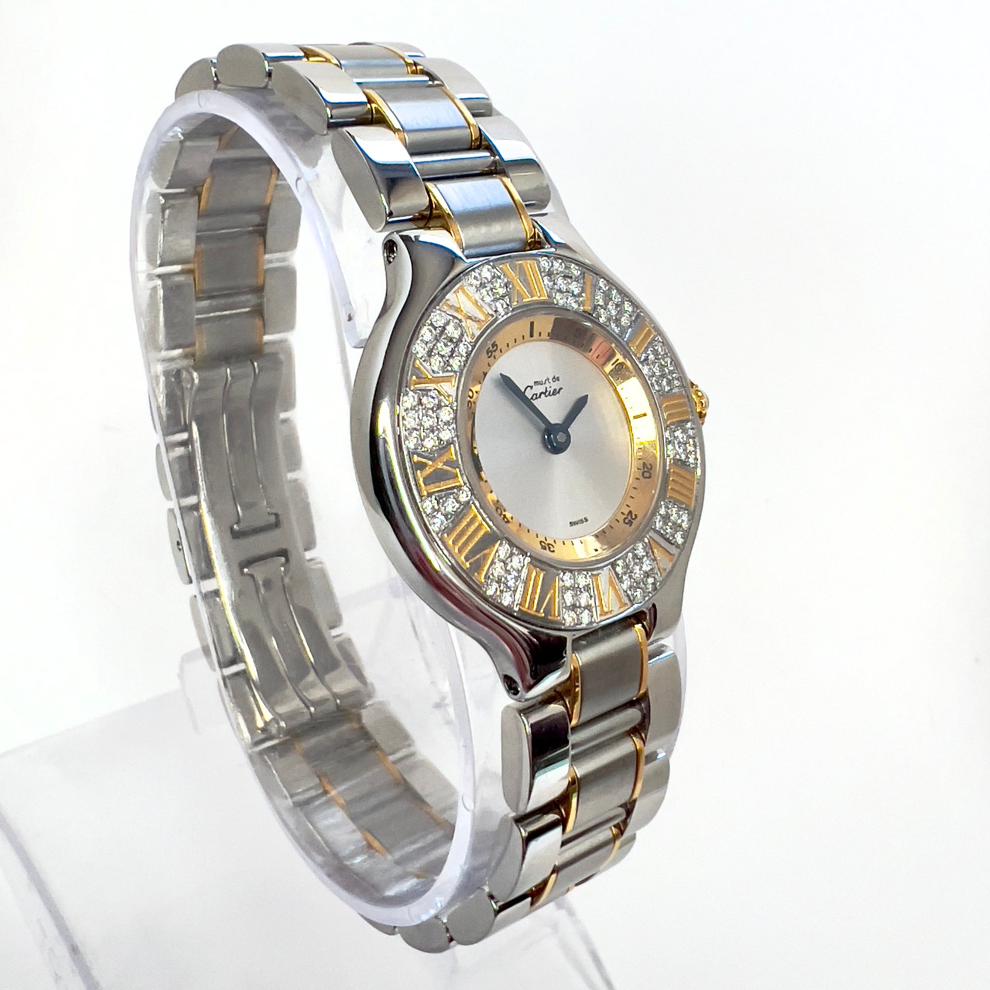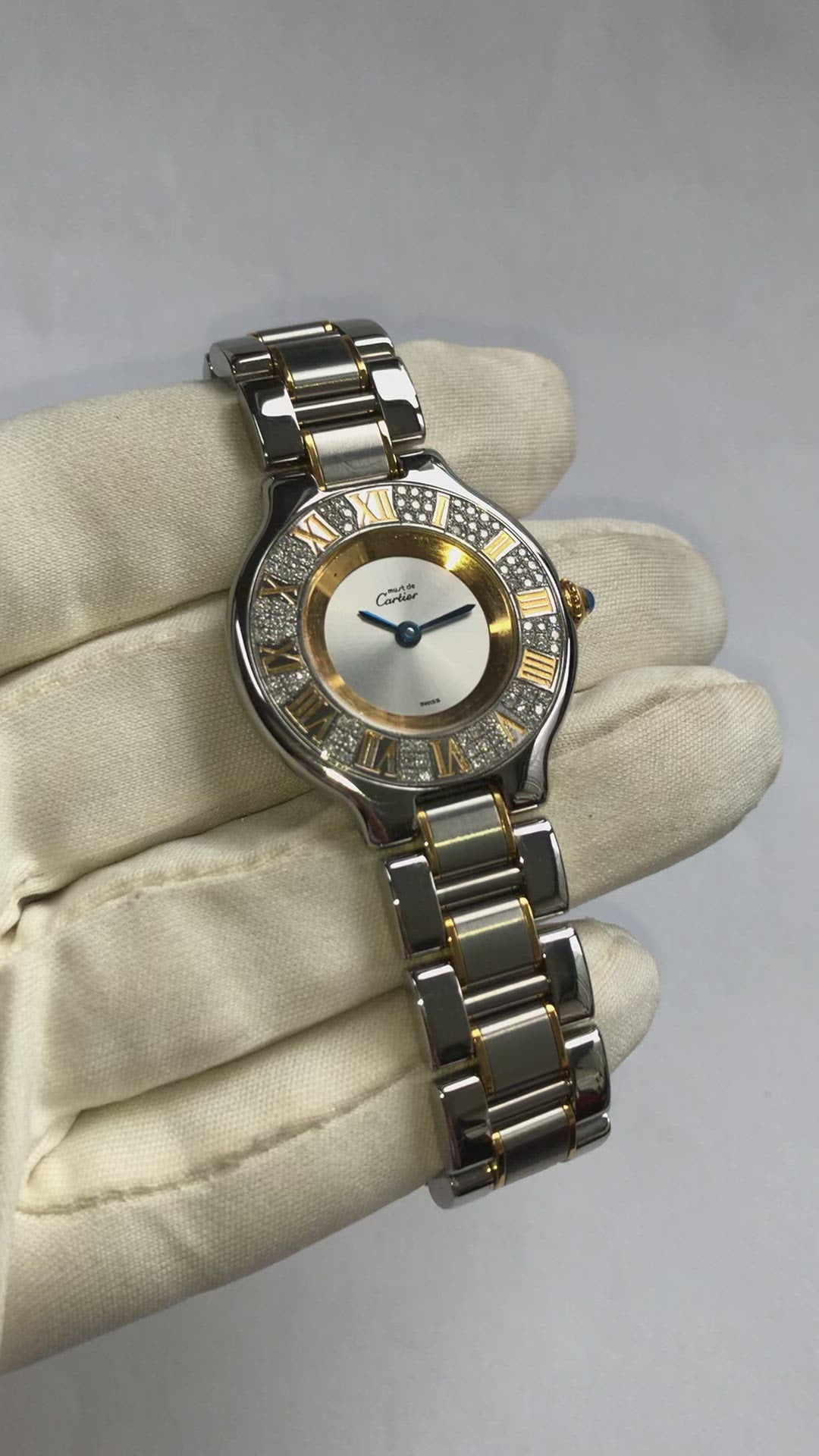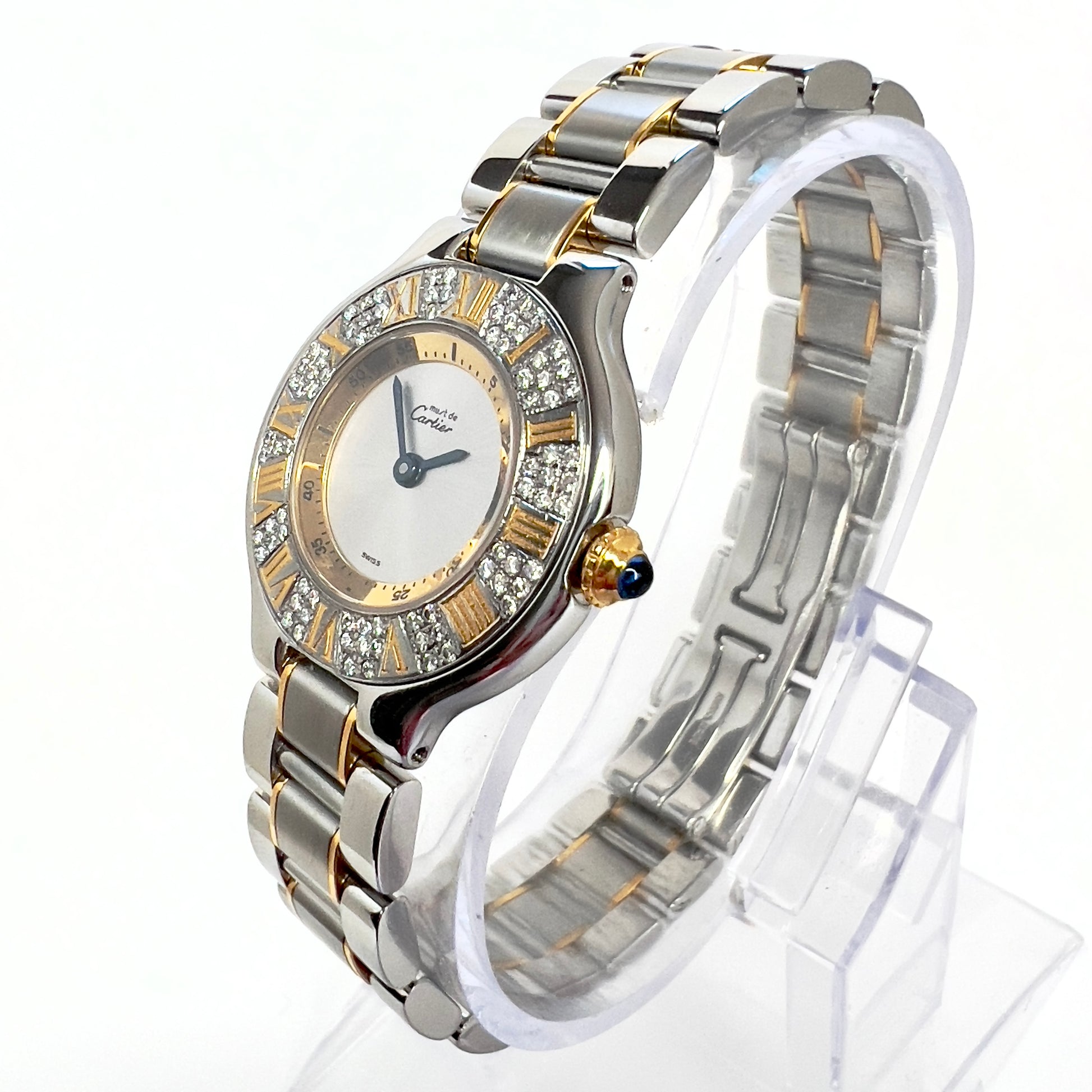 Authentic Pre Owned CARTIER MUST 21 Quartz 28mm 2 Tone Watch 0.40TCW Diamonds