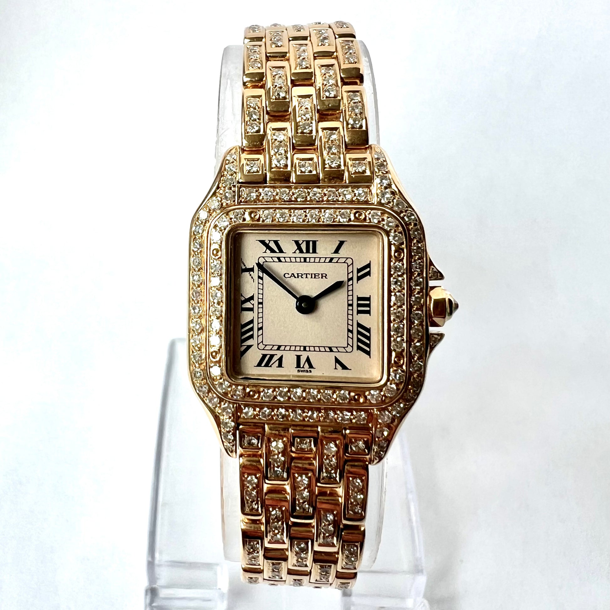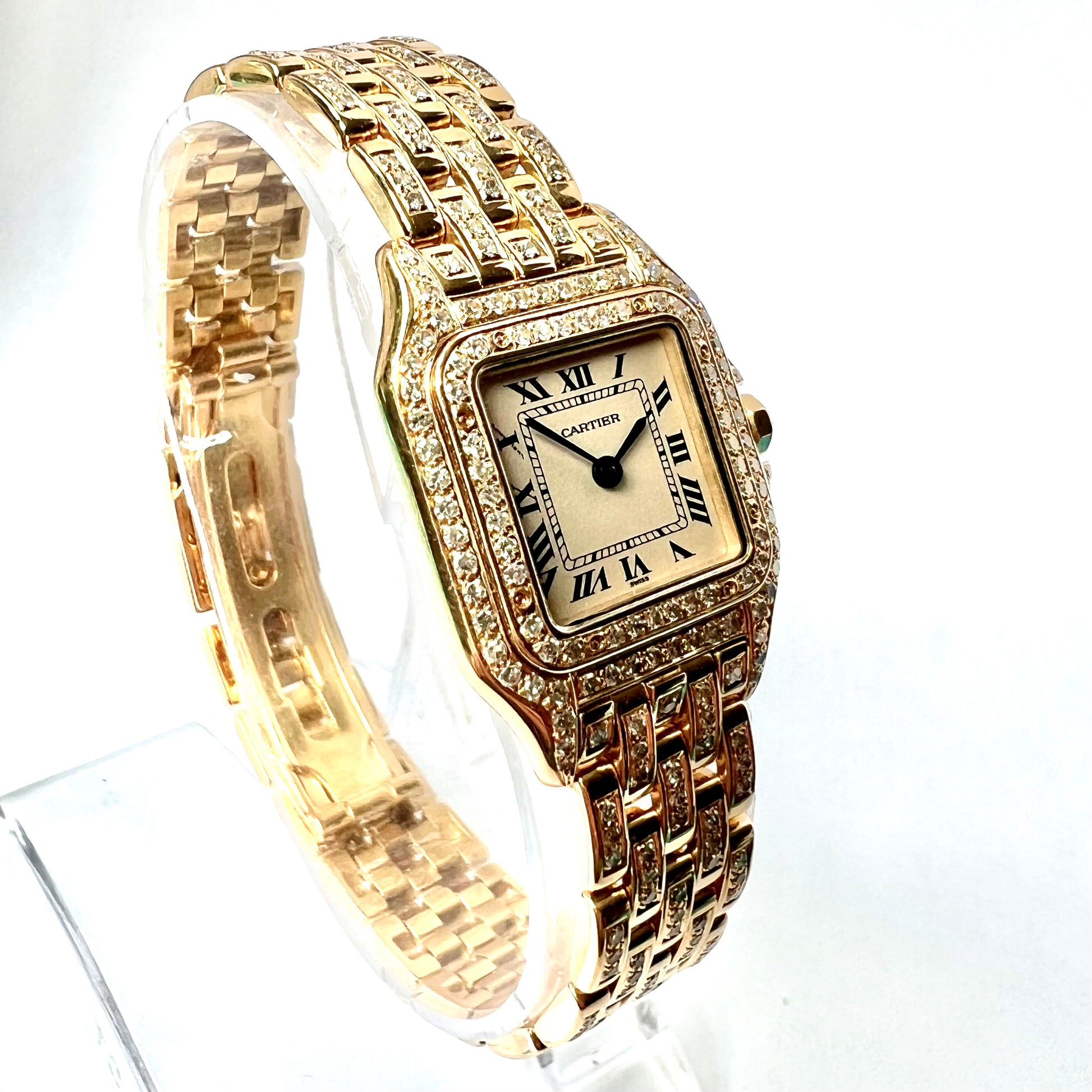 • Case: Glossy 18K Yellow Gold set with F-G VS-SI Custom Natural Diamonds and hallmarked ‘Cartier’, ‘Quartz’, ‘18K', 'Swiss Made’ and Serial Number