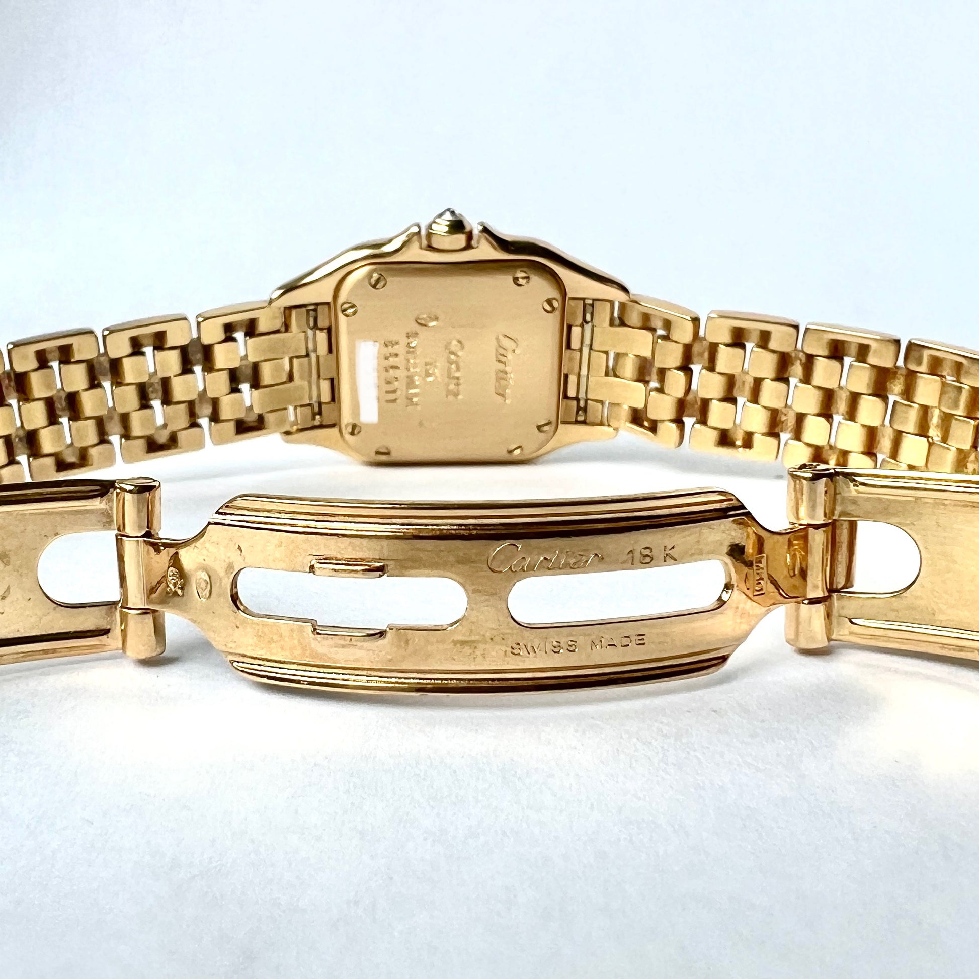 • Clasp: Yellow Gold Hidden Double Fold with Cartier Logo and Stamped 'Cartier', '18K', Swiss Made', '750'.