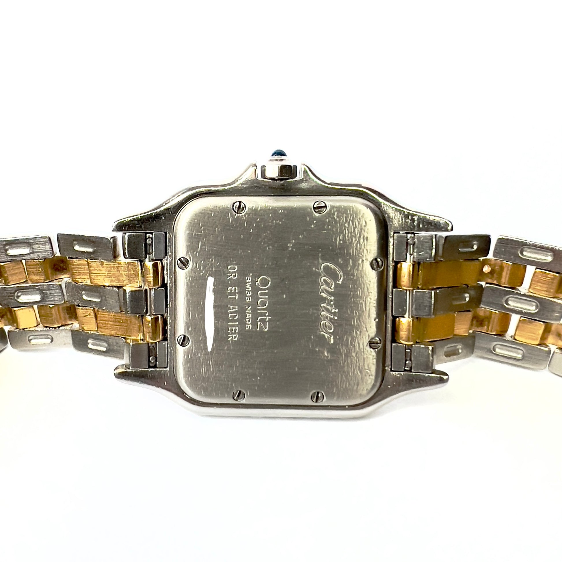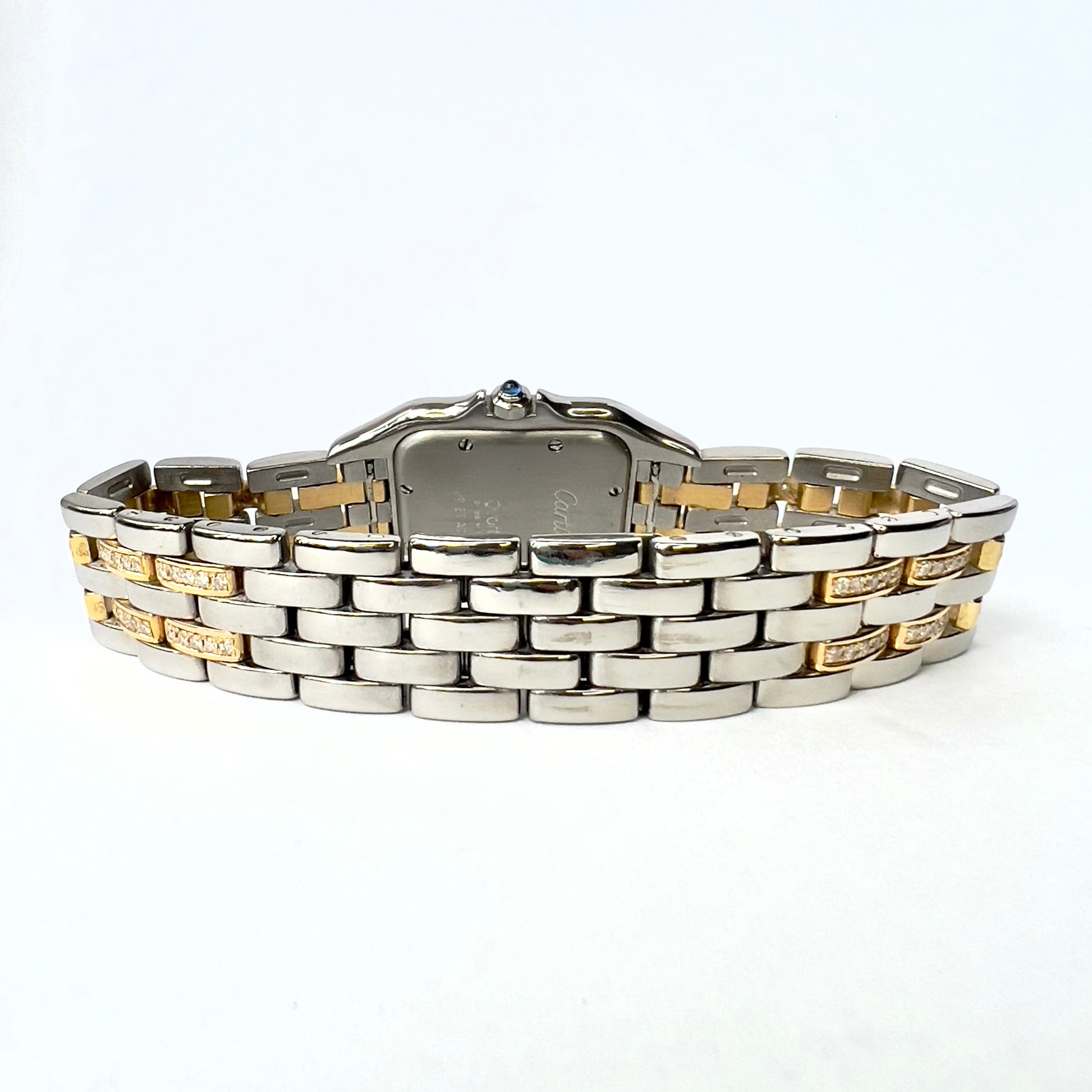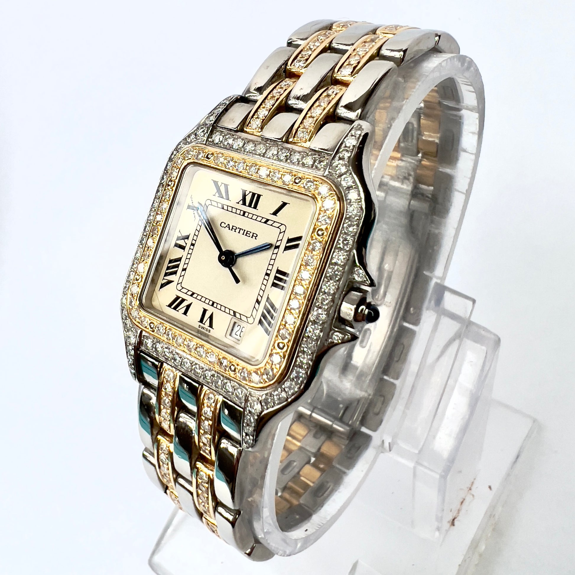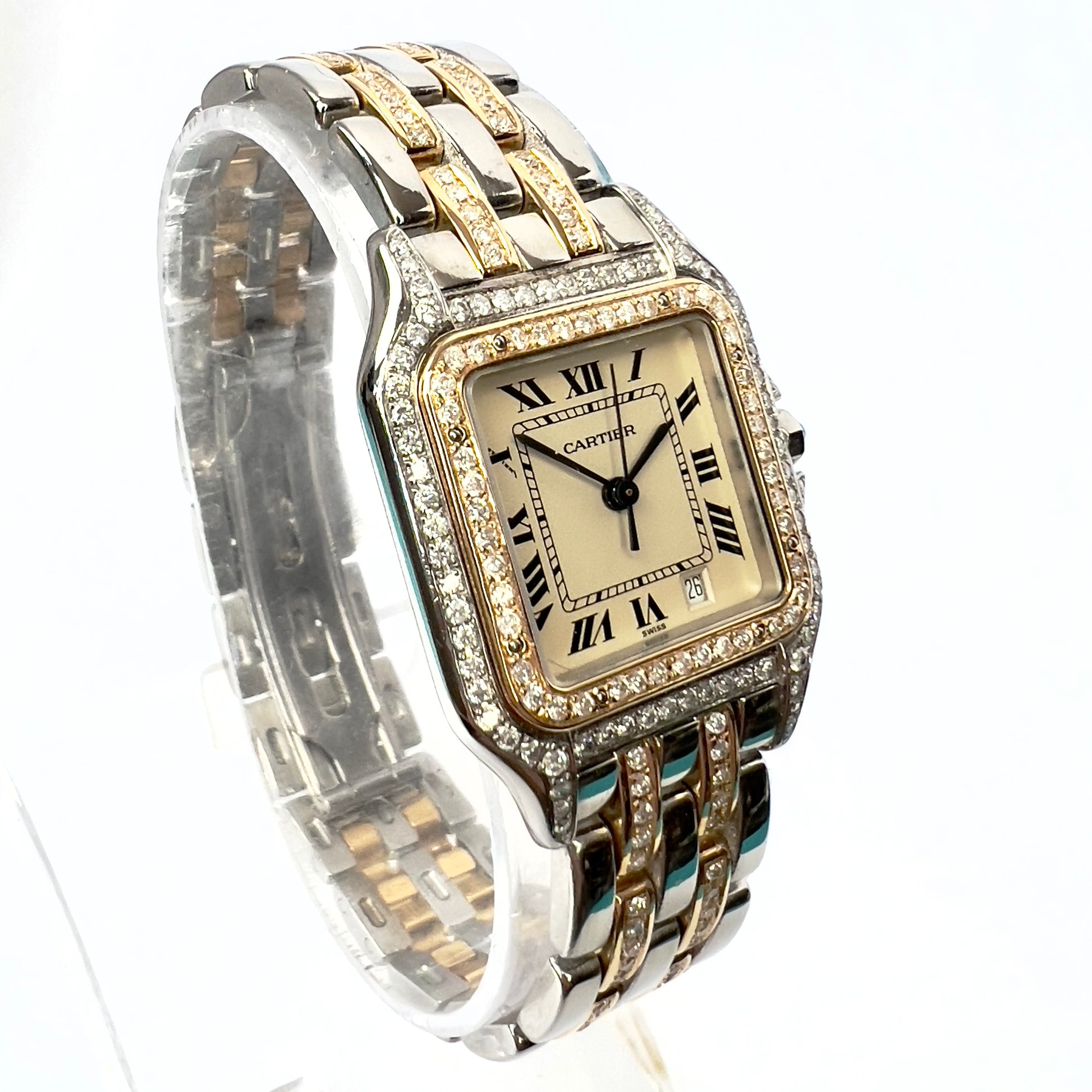Case: Stainless Steel Set with Custom Natural Diamonds hallmarked ‘Cartier’ and stamped ‘Quartz', 'Swiss Made', 'OR ET ACIER' and Serial Number.