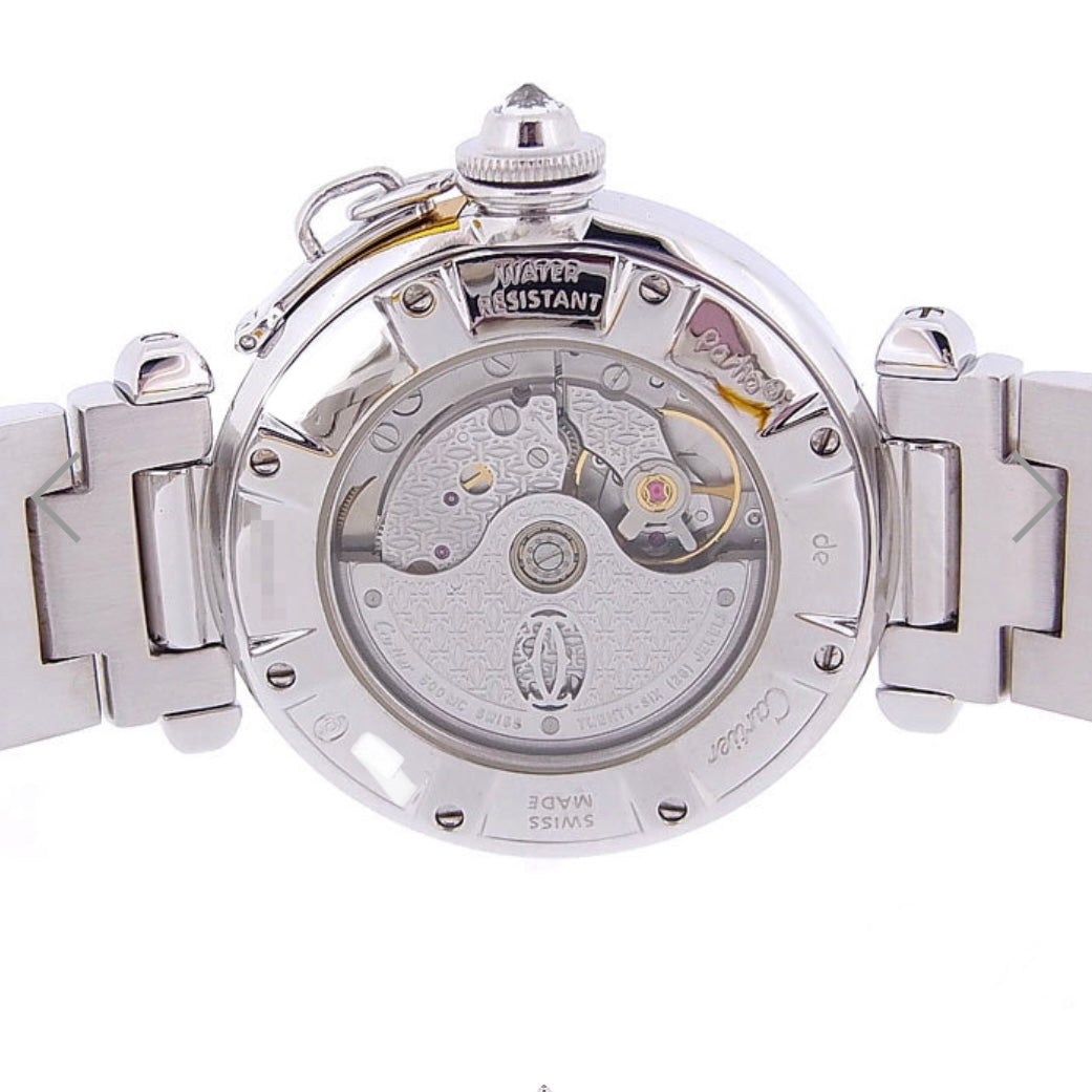 • Case: Stainless Steel Skeleton Backcase, hallmarked ‘Cartier Pasha’ and stamped ‘Automatic’, ‘Water Resistant ', 'Stainless Steel’, ‘Swiss Made’, ‘Serial Number.
