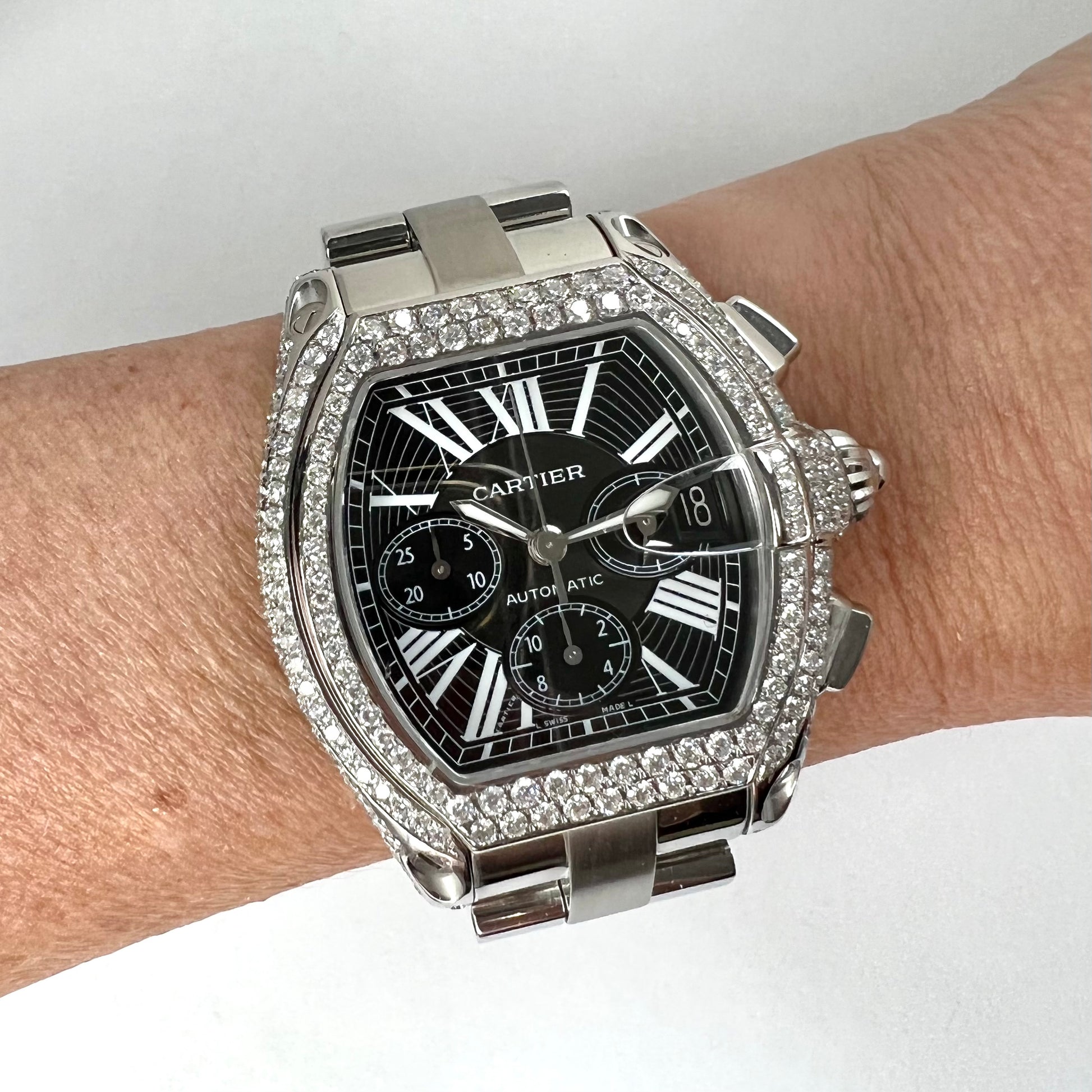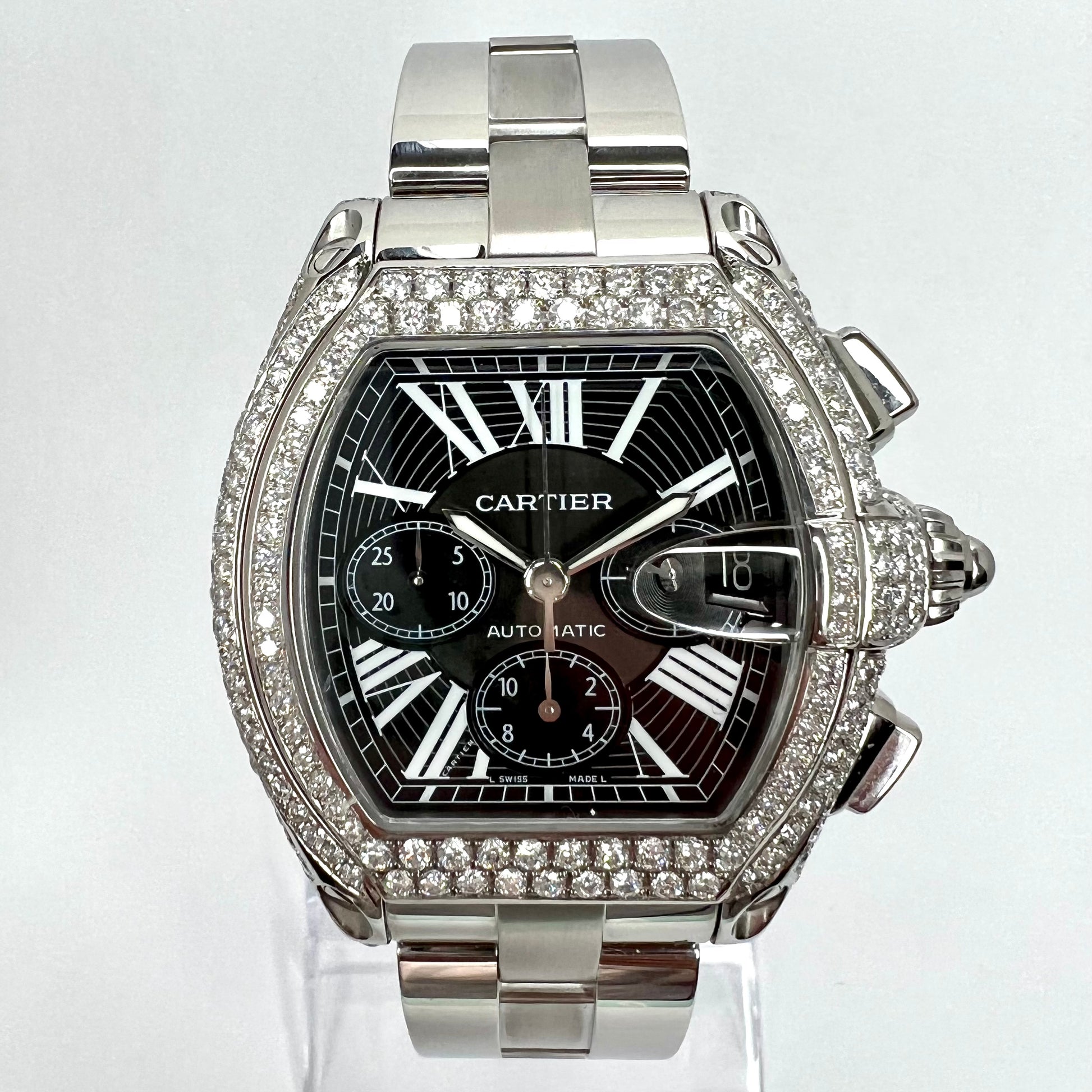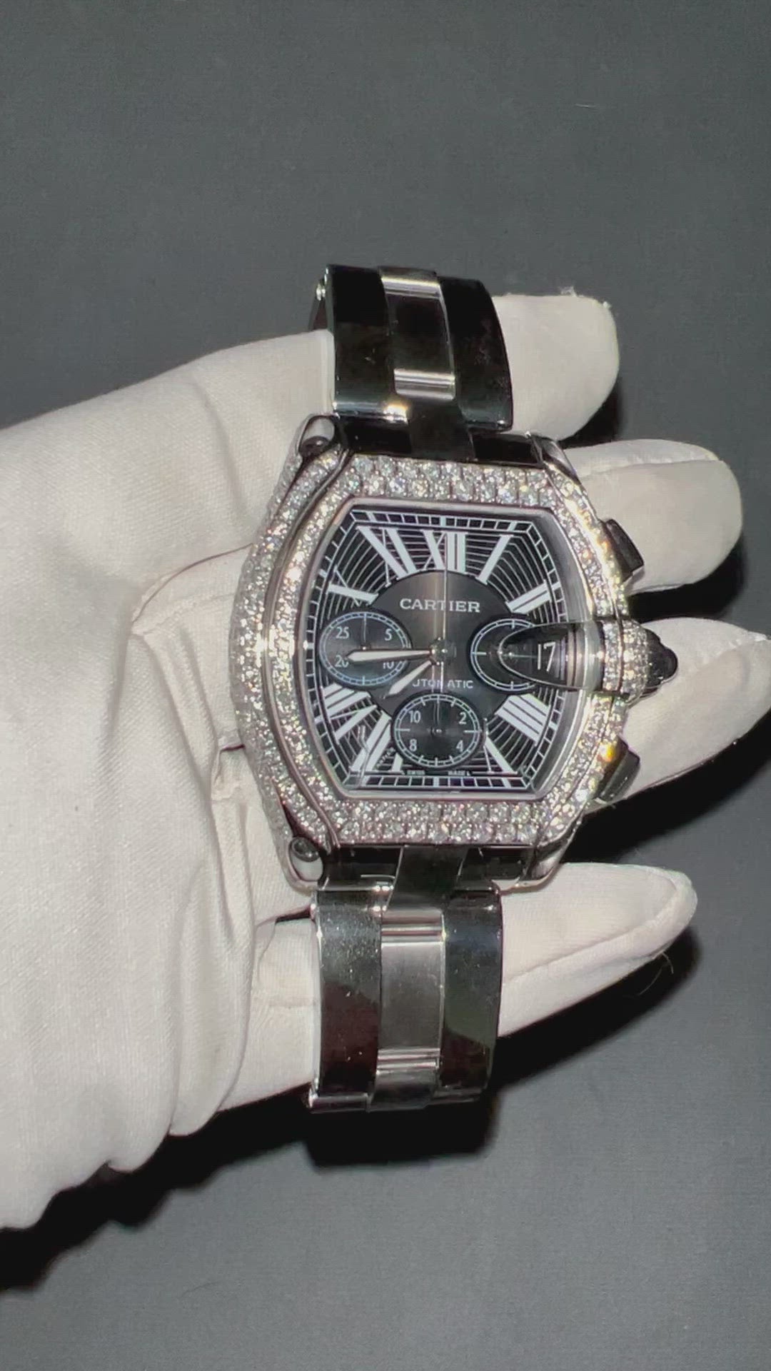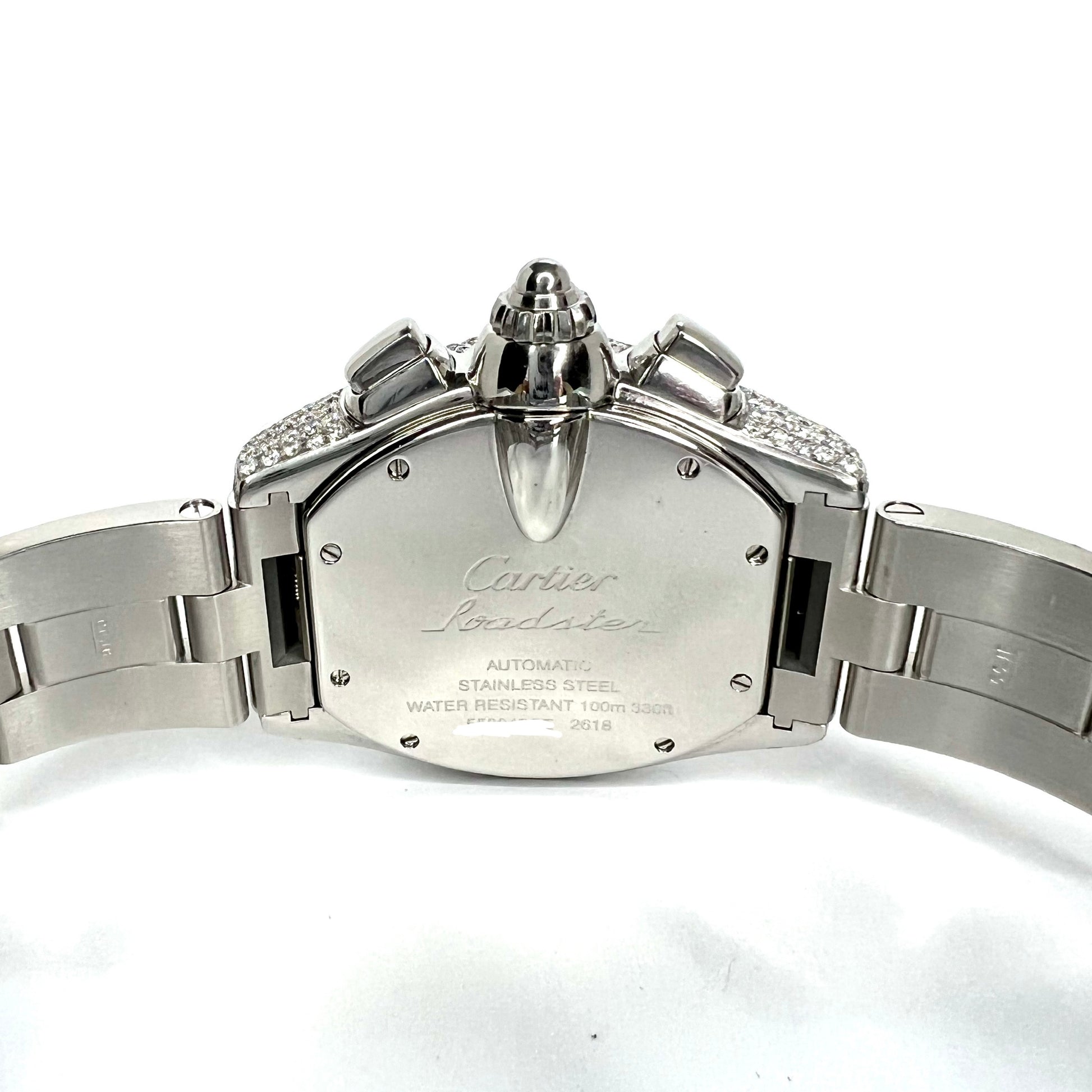 Case: Domed Glossy Stainless Steel set with Custom Diamonds stamped Cartier Roadster, Automatic, Stainless Steel, Water Resistant 100m 330ft, 2618 and Serial Number.