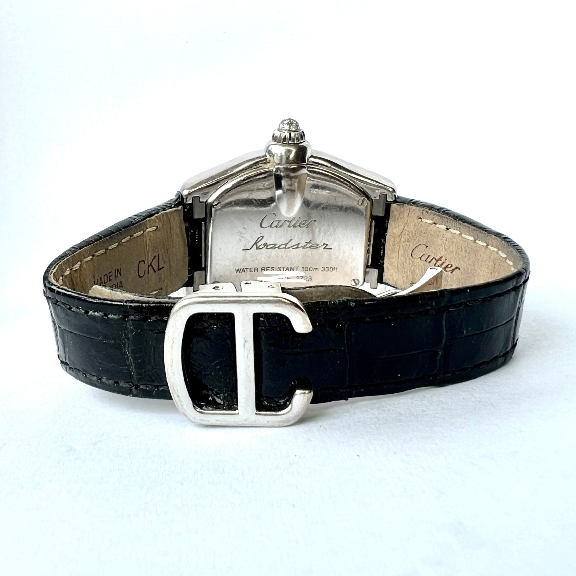 • Case: Glossy 18K White Gold hallmarked ‘Cartier’ and stamped ‘Roadster', 'Water Resistant', 330ft/100m, 750, 2723 and Serial Number