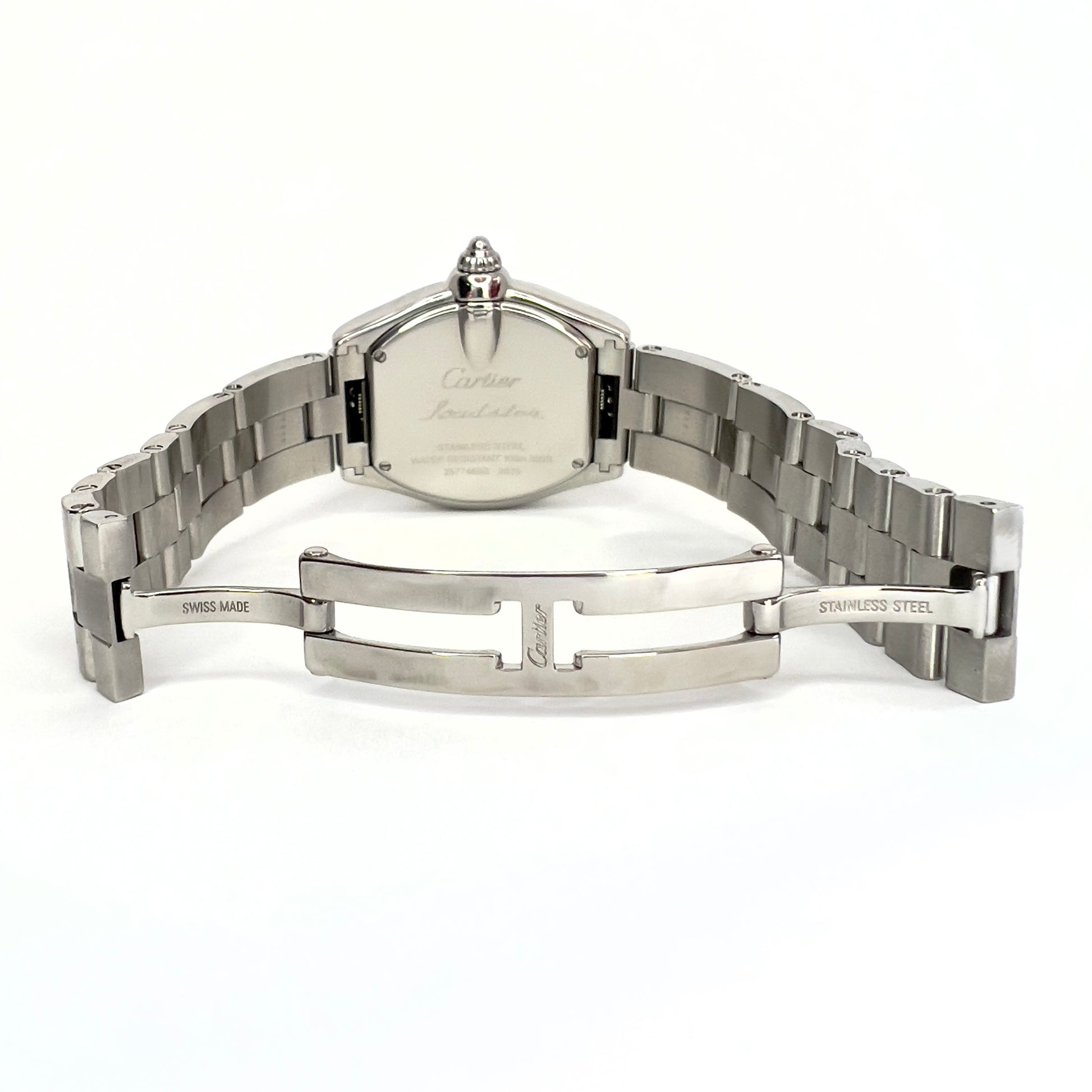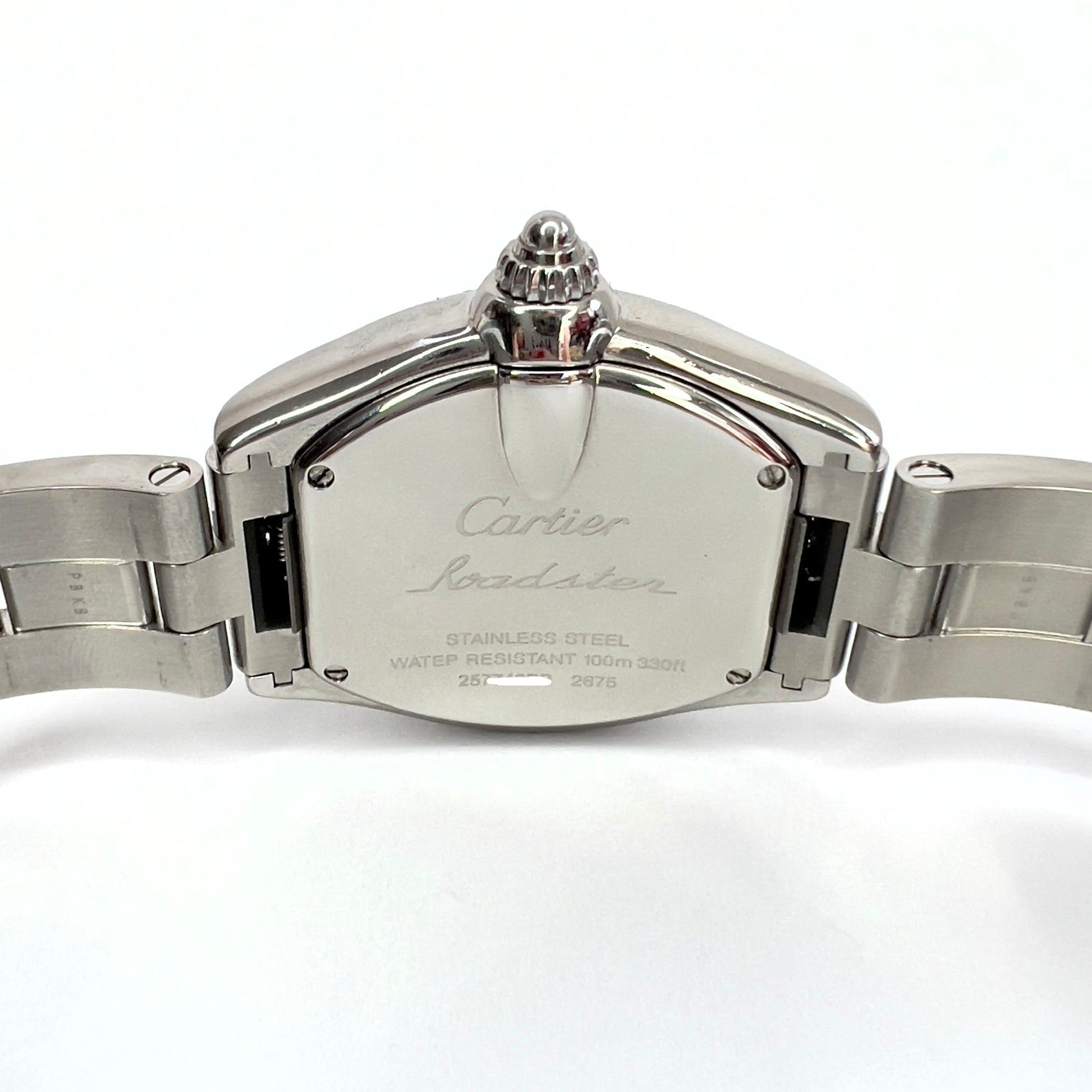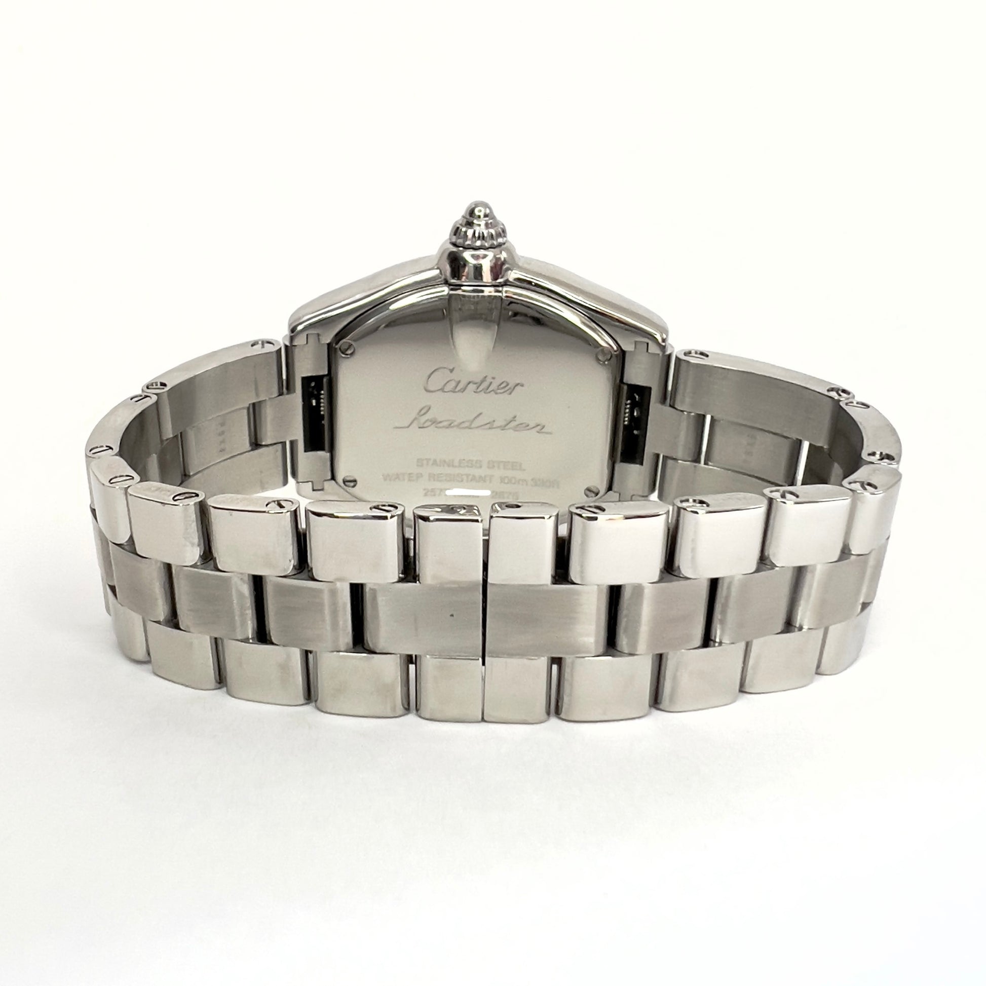 Case: Domed Glossy Stainless Steel set with Custom Natural Diamonds stamped Cartier Roadster, Stainless Steel, Water Resistant 100m 330ft, 2675 and Serial Number.
