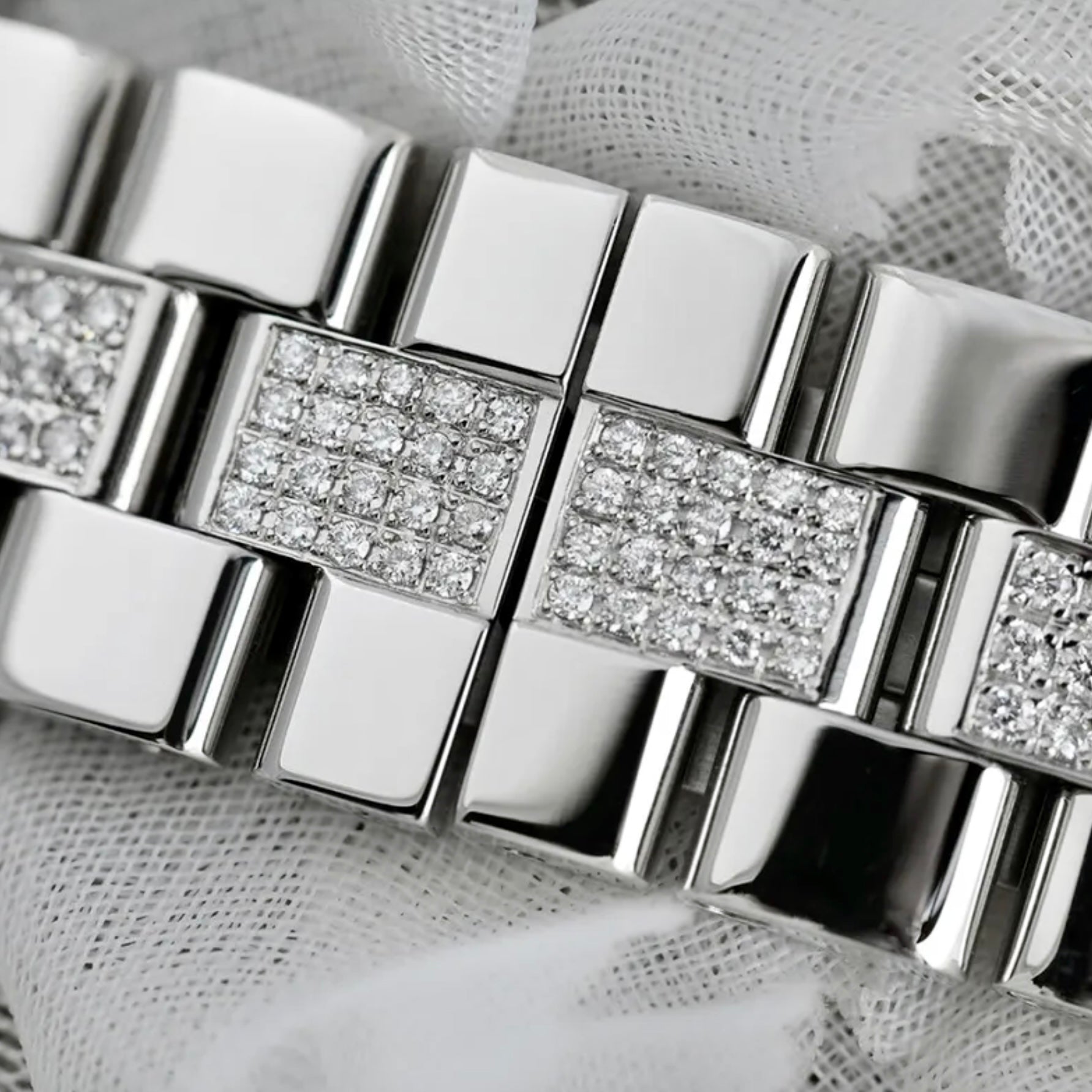 • Bracelet: Glossy and Brushed Stainless Steel set with Custom Natural Diamonds. Fits approx. 6.25 inches wrist. Extra links available.