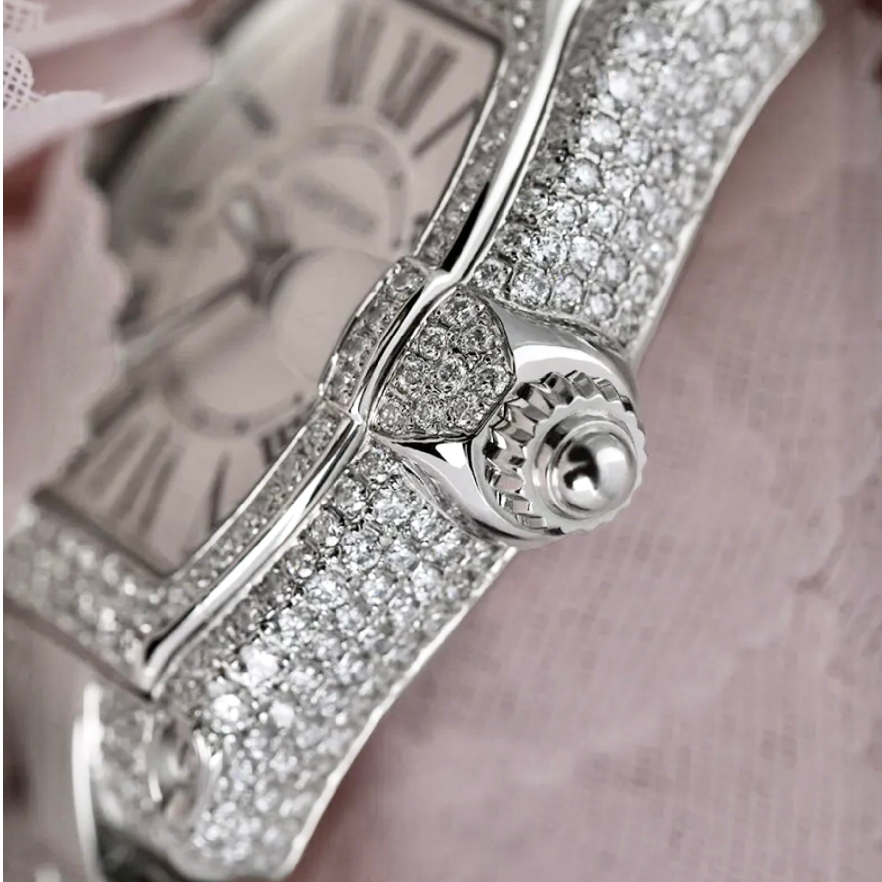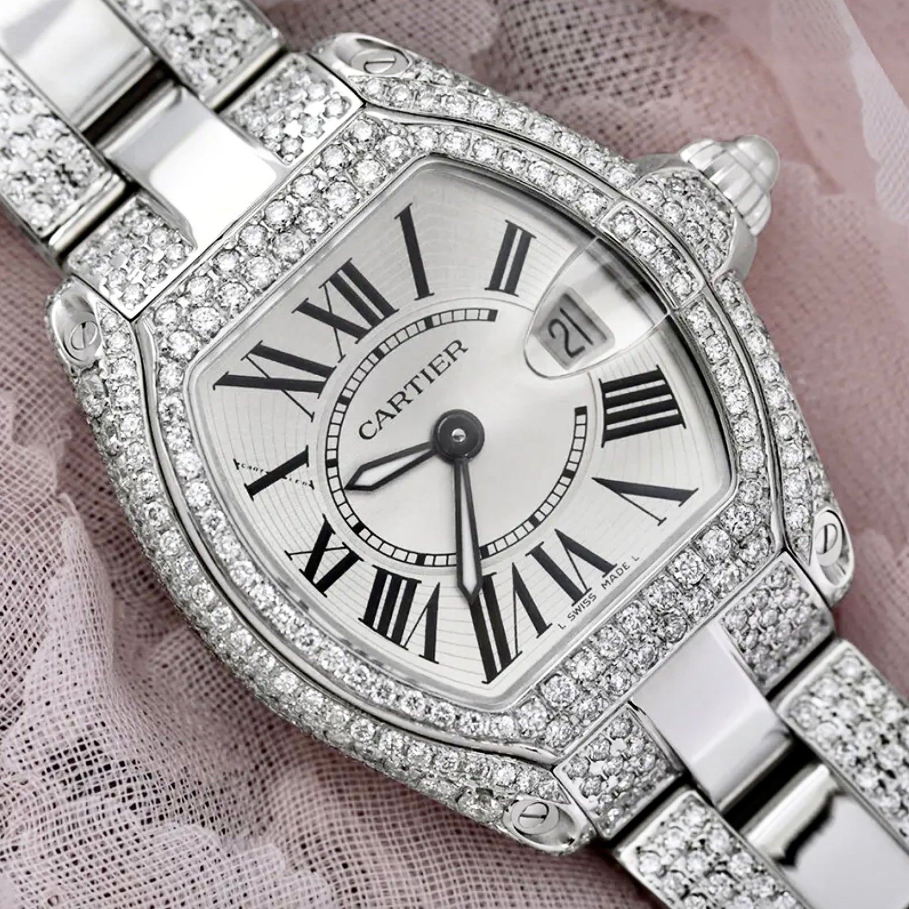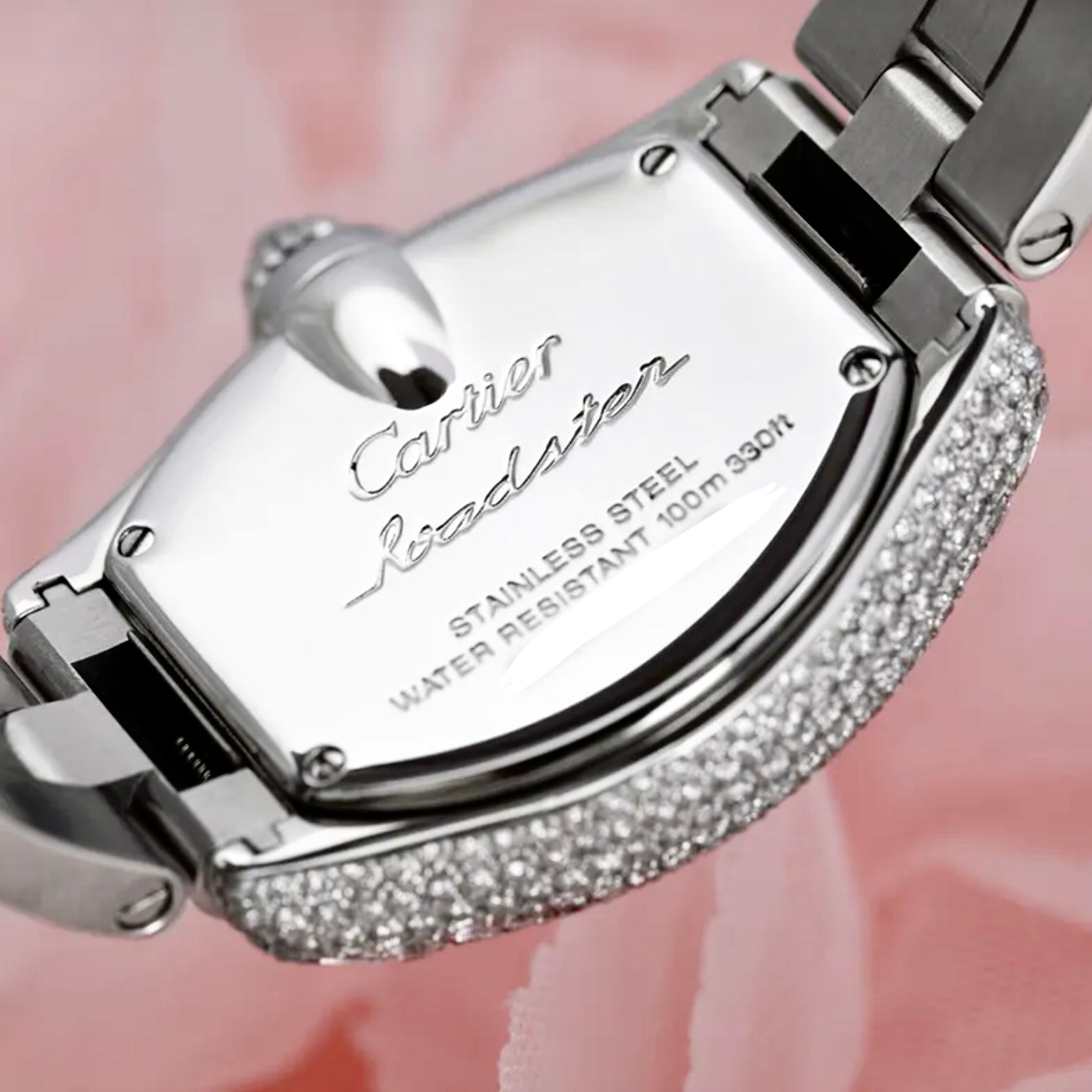 Case: Domed Glossy Stainless Steel set with Custom Natural Diamonds stamped Cartier Roadster, Stainless Steel, Water Resistant 100m 330ft, 2675 and Serial Number.