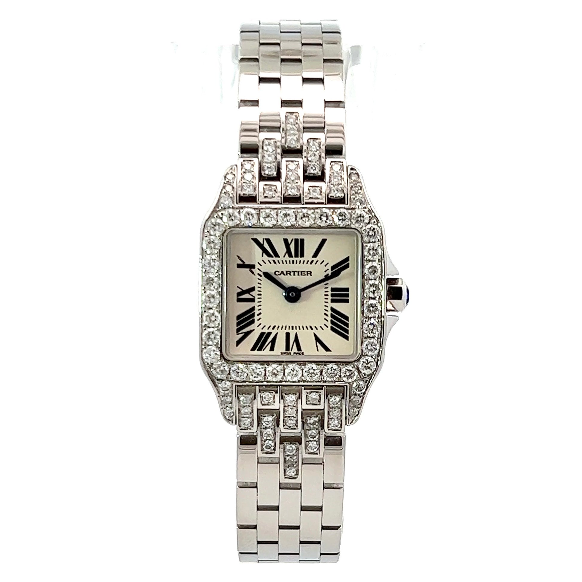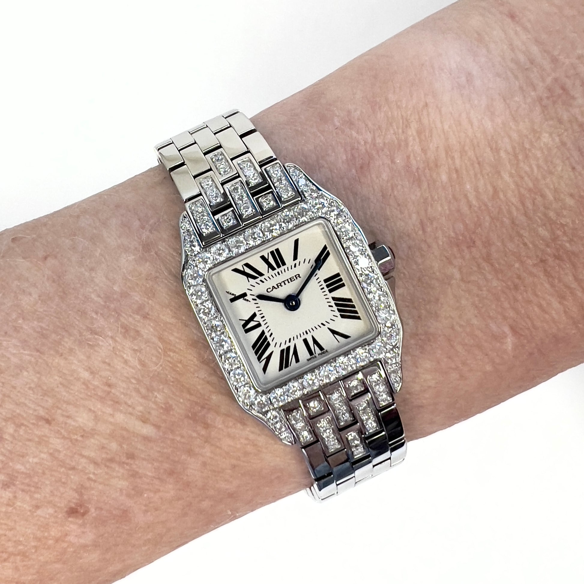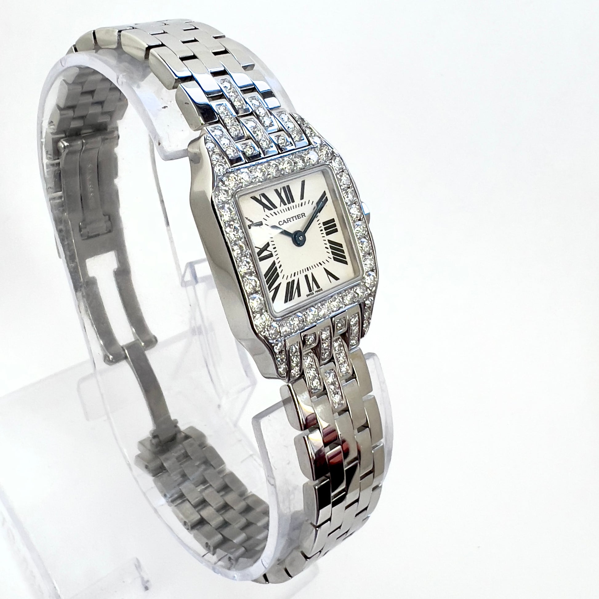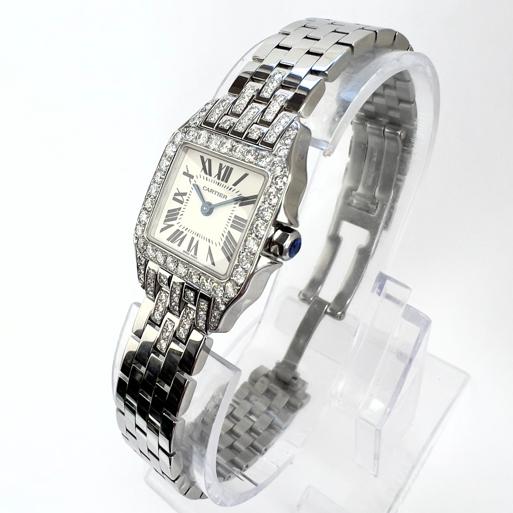 Case: Glossy Stainless Steel Set with F-G VS-SI Natural Custom Diamonds, stamped Cartier, Water Resistant, Stainless Steel, Swiss Made and Serial Numbers.