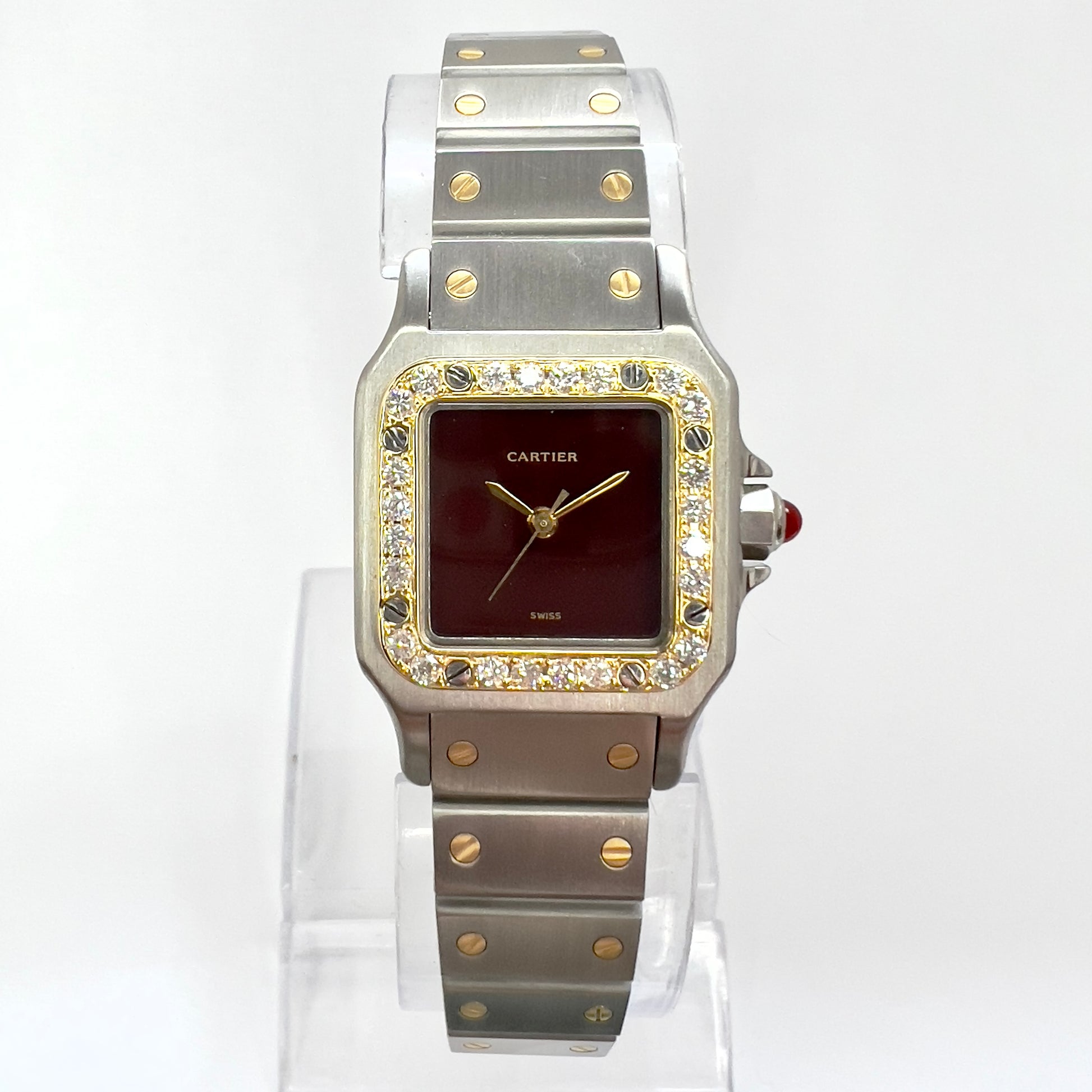 • Dial: Burgundy color, hallmarked 'Cartier', 'Swiss'.