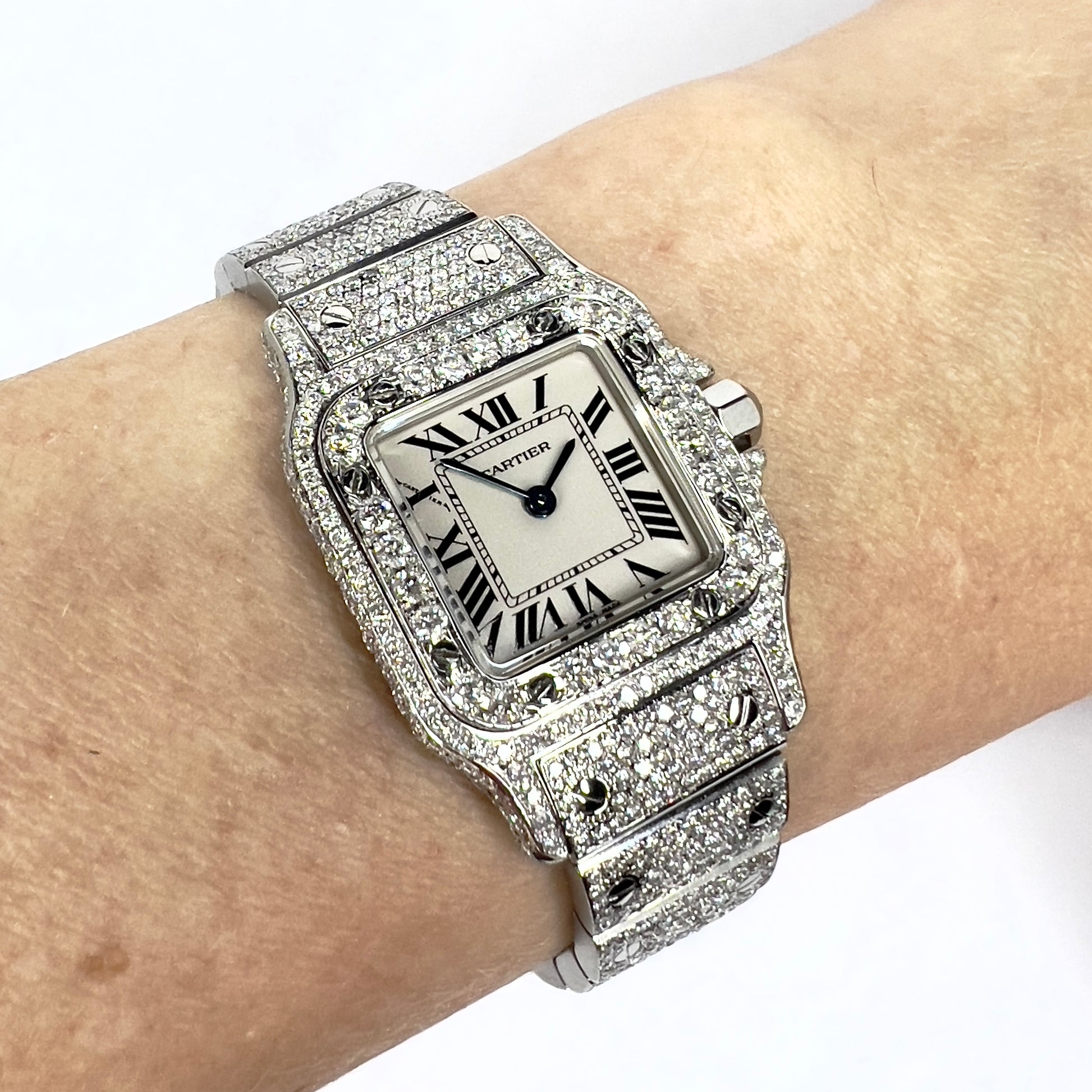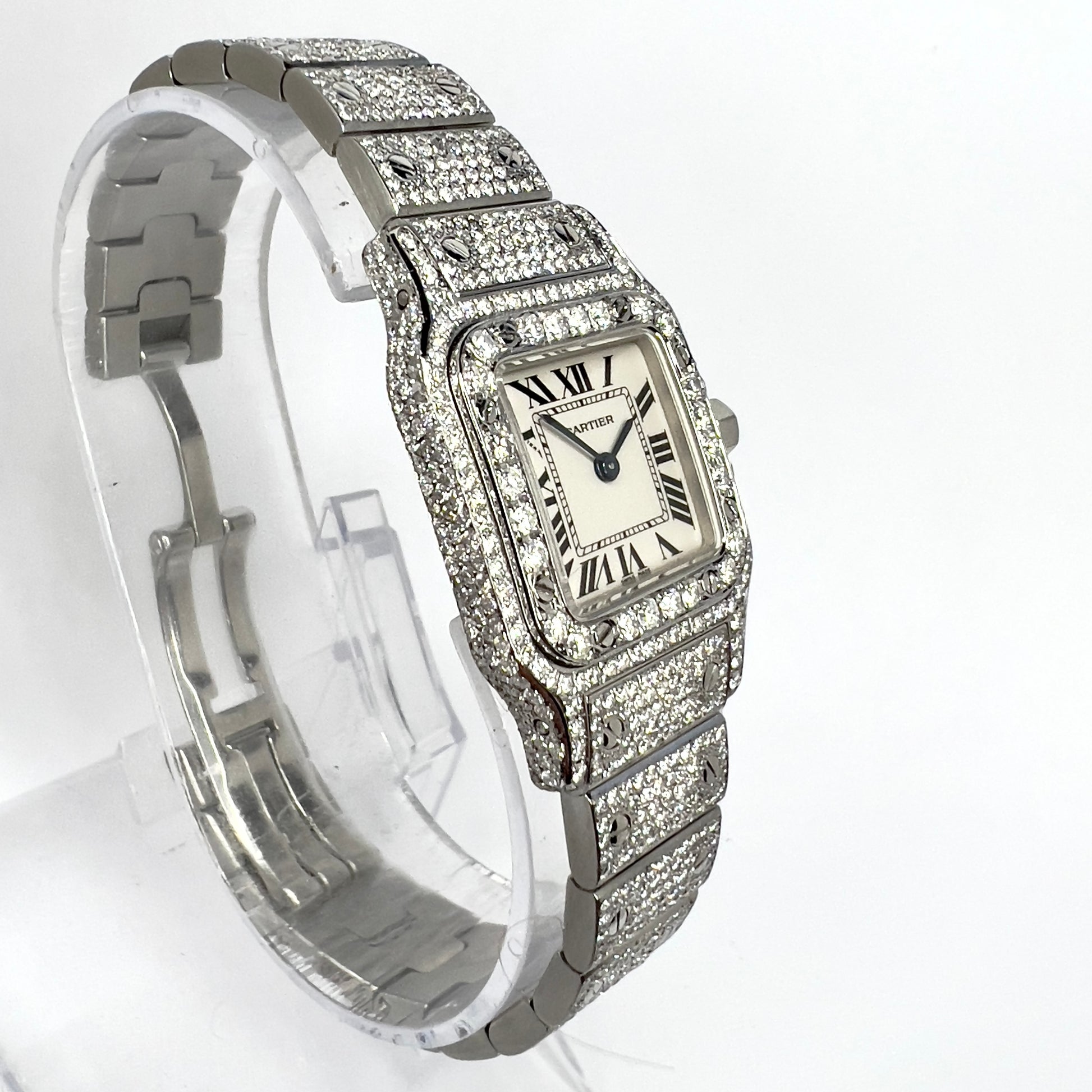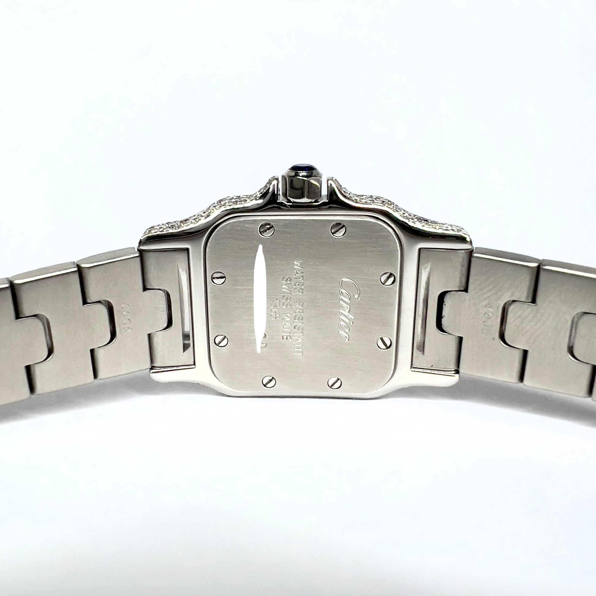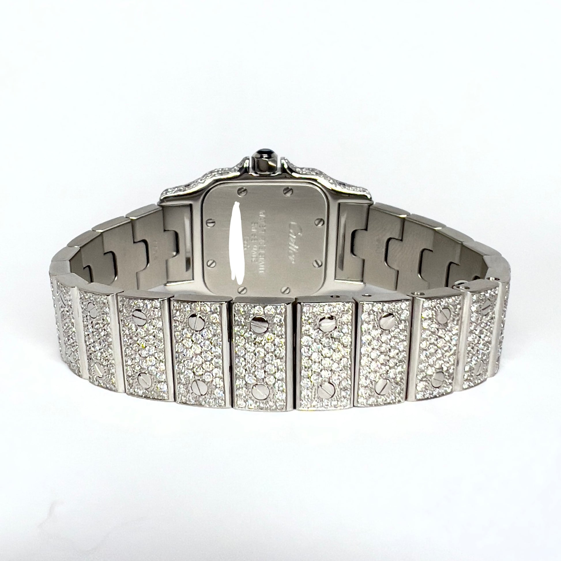 • Case: Steel set with Custom Natural Diamonds and hallmarked Cartier, Water Resistant, Swiss Made, 1565 and Serial Number