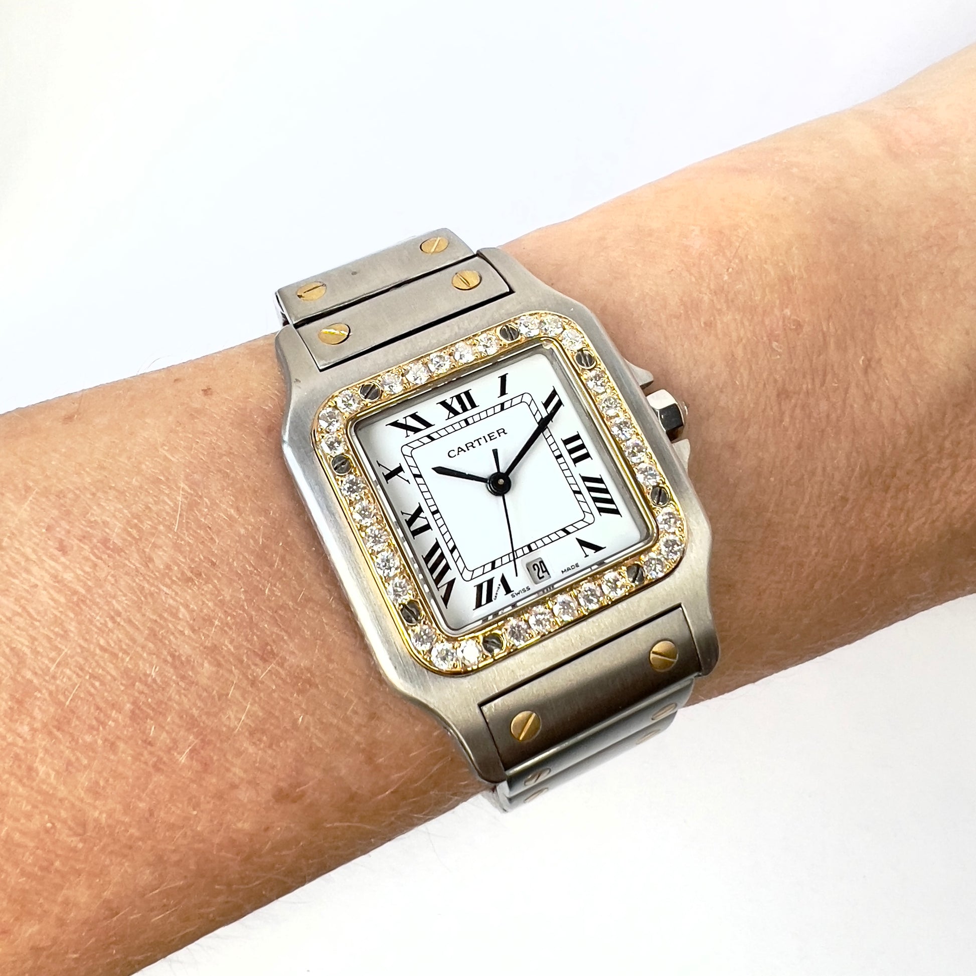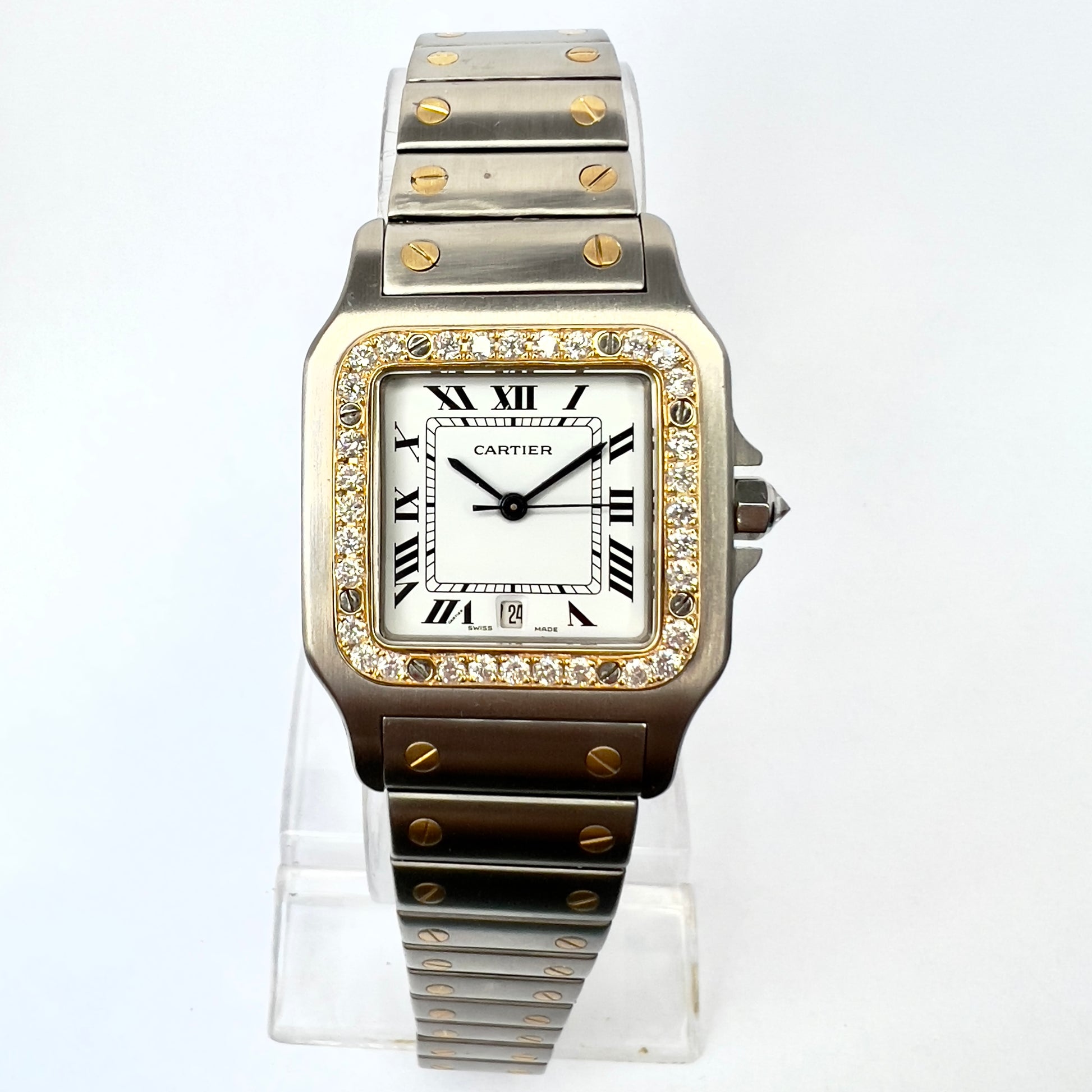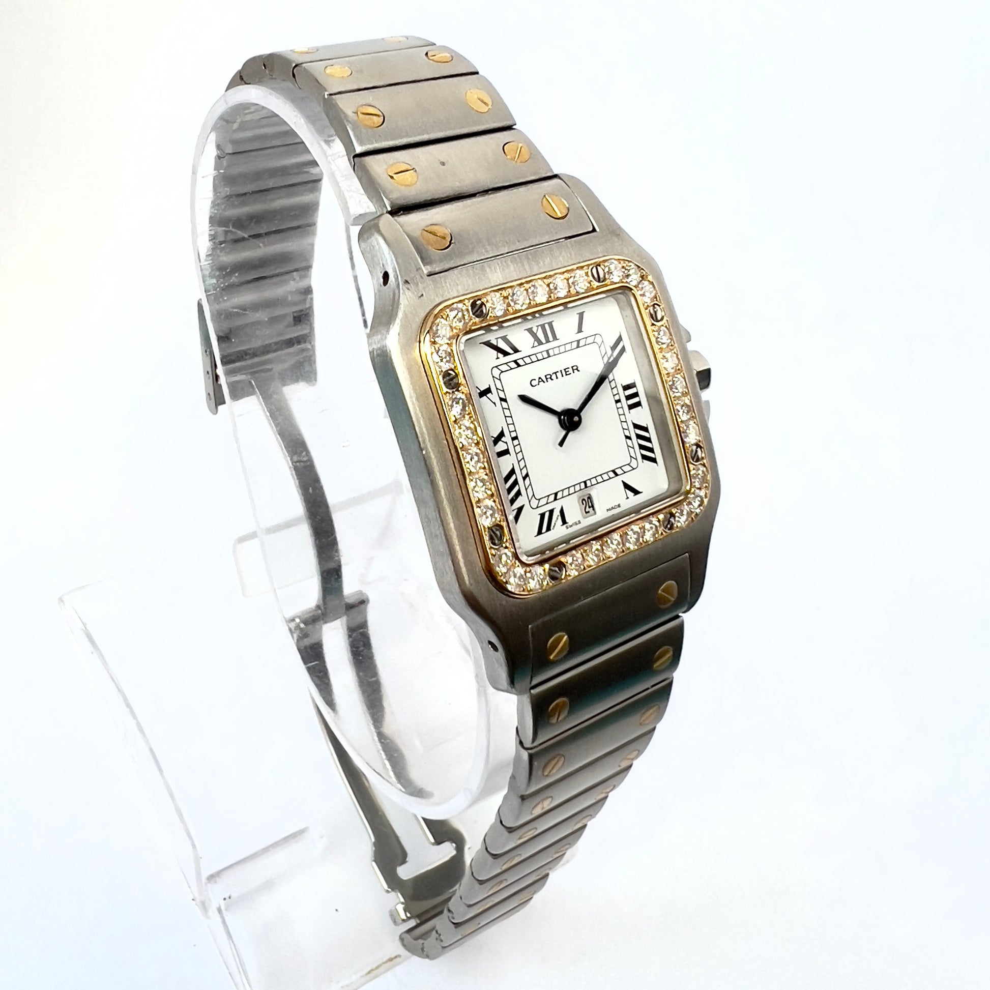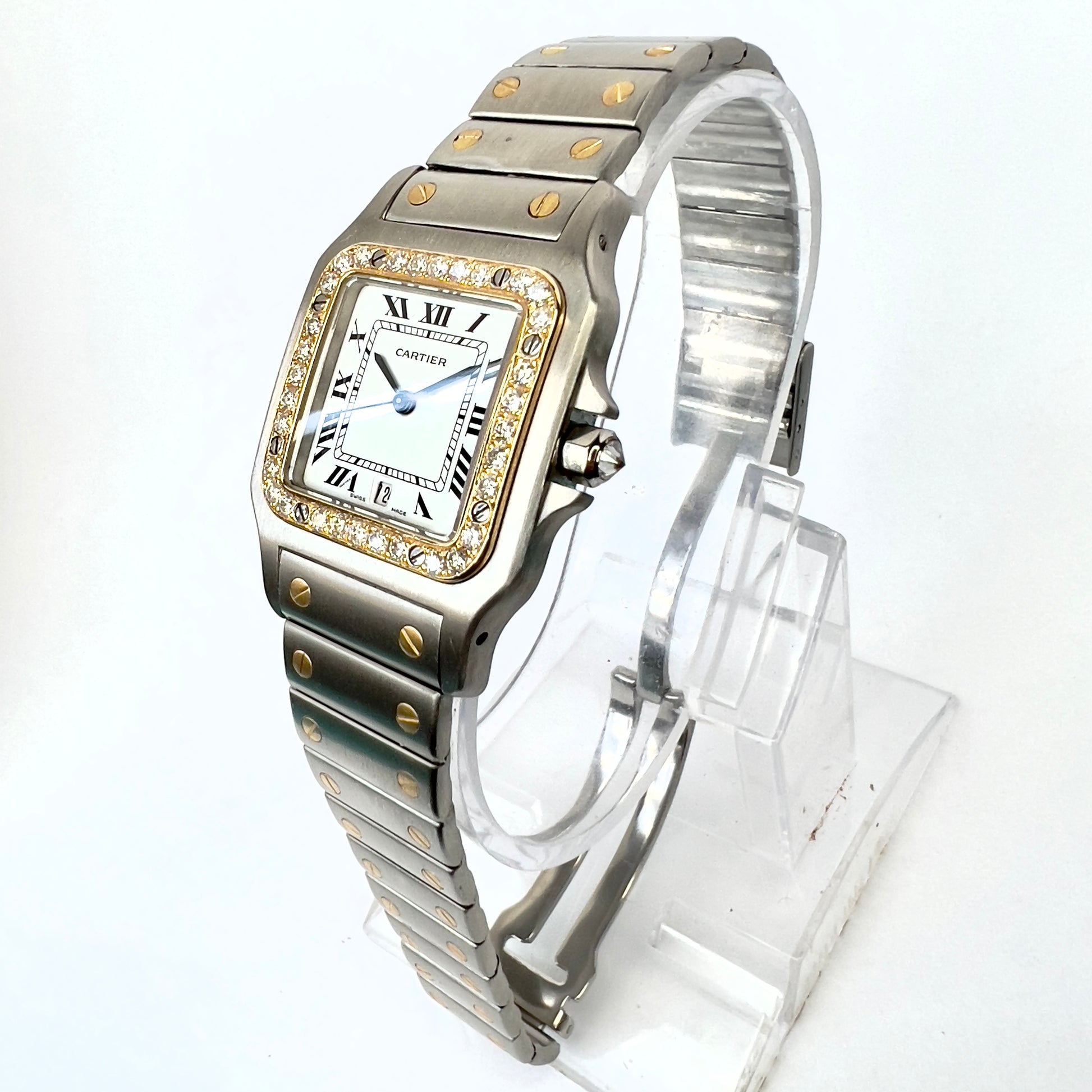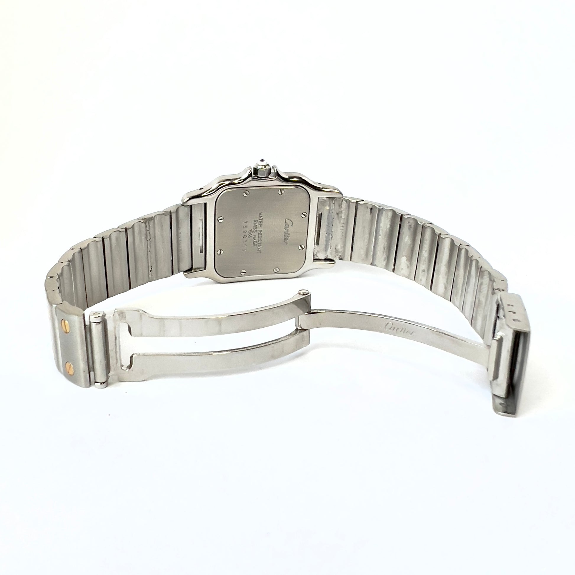 • Case: Brushed Stainless Steel hallmarked ‘Santos de Cartier’ and stamped ‘Quartz', ‘Swiss Made’, ‘Or Et Acier’ and Serial Number