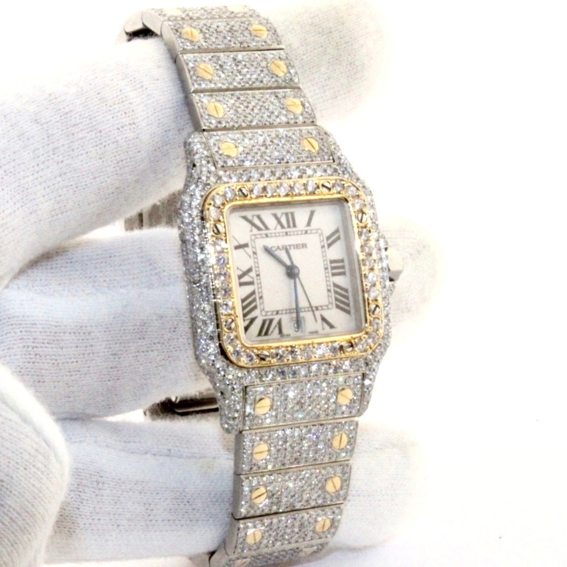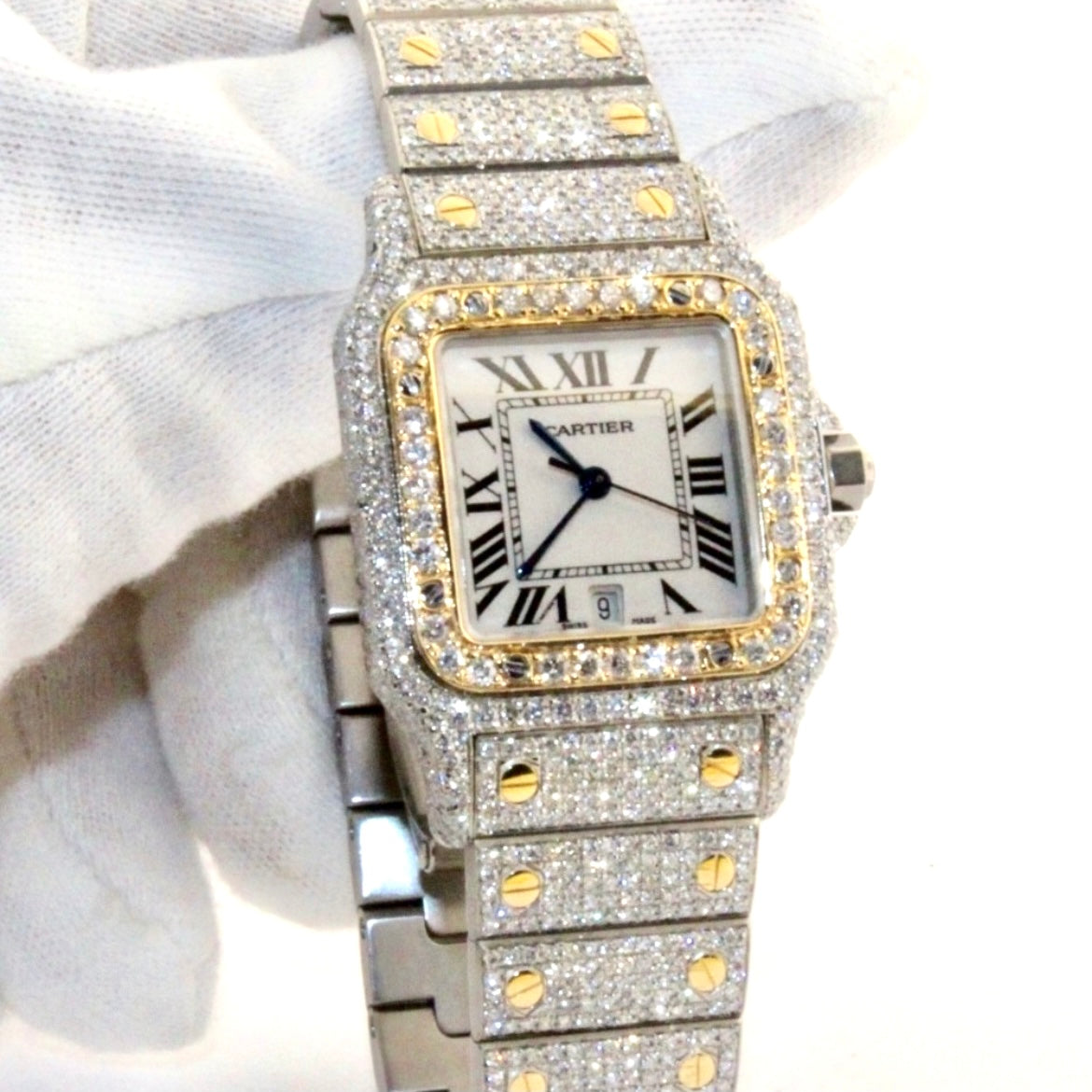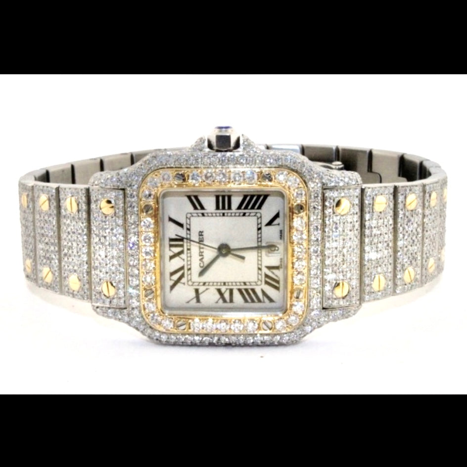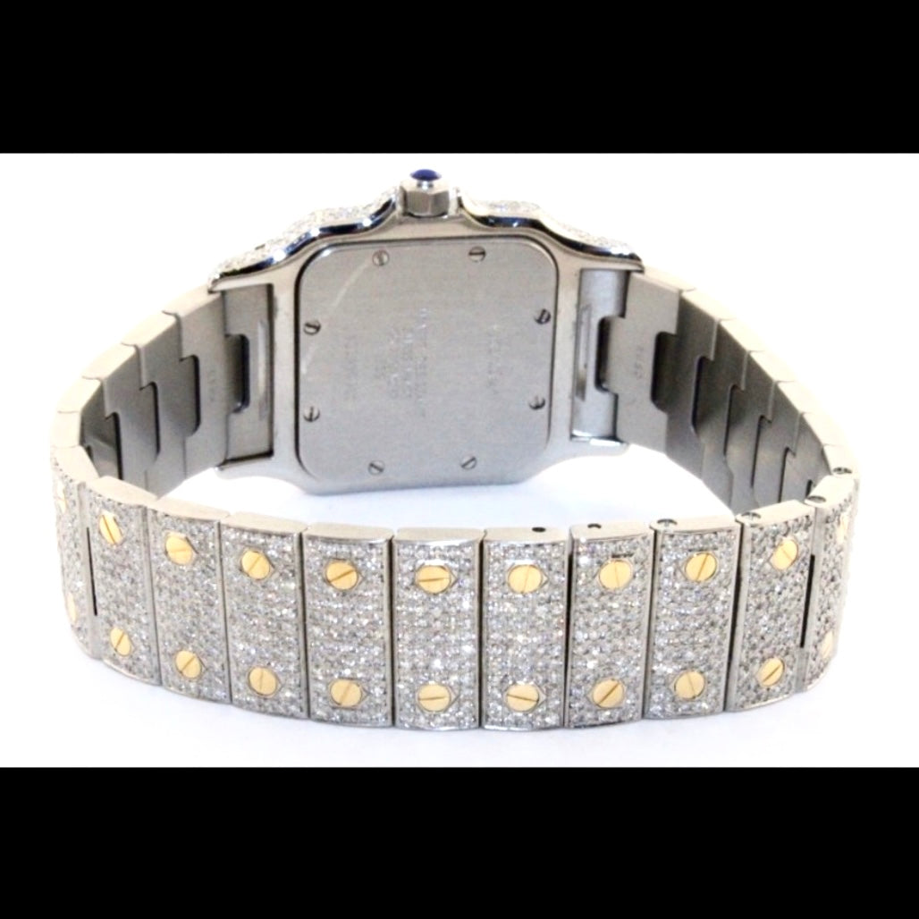• Case: Brushed Stainless Steel set with Custom Natural Diamonds hallmarked ‘Santos de Cartier’ and stamped ‘Quartz', ‘Swiss Made’, ‘OR ET ACIER’ and Serial Number