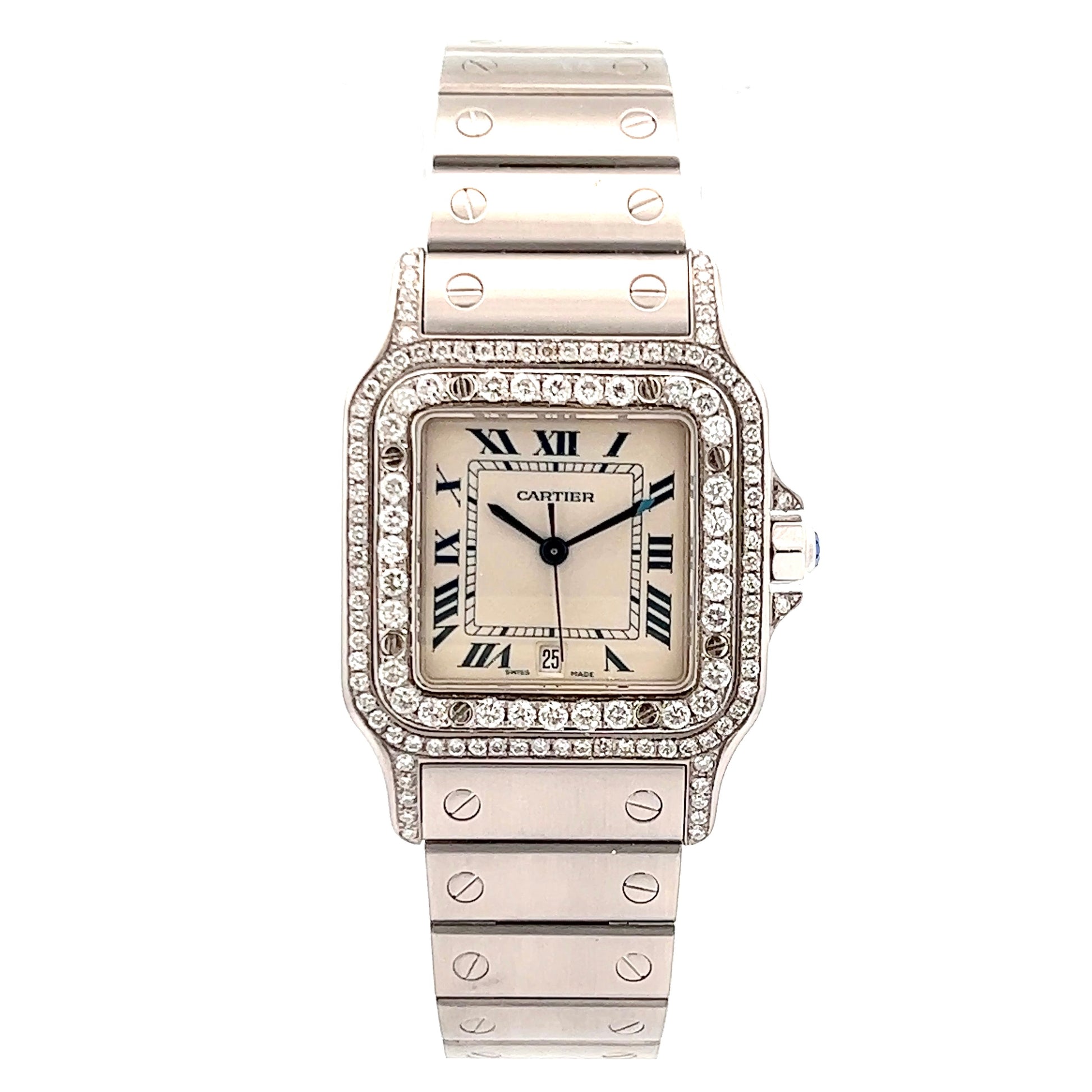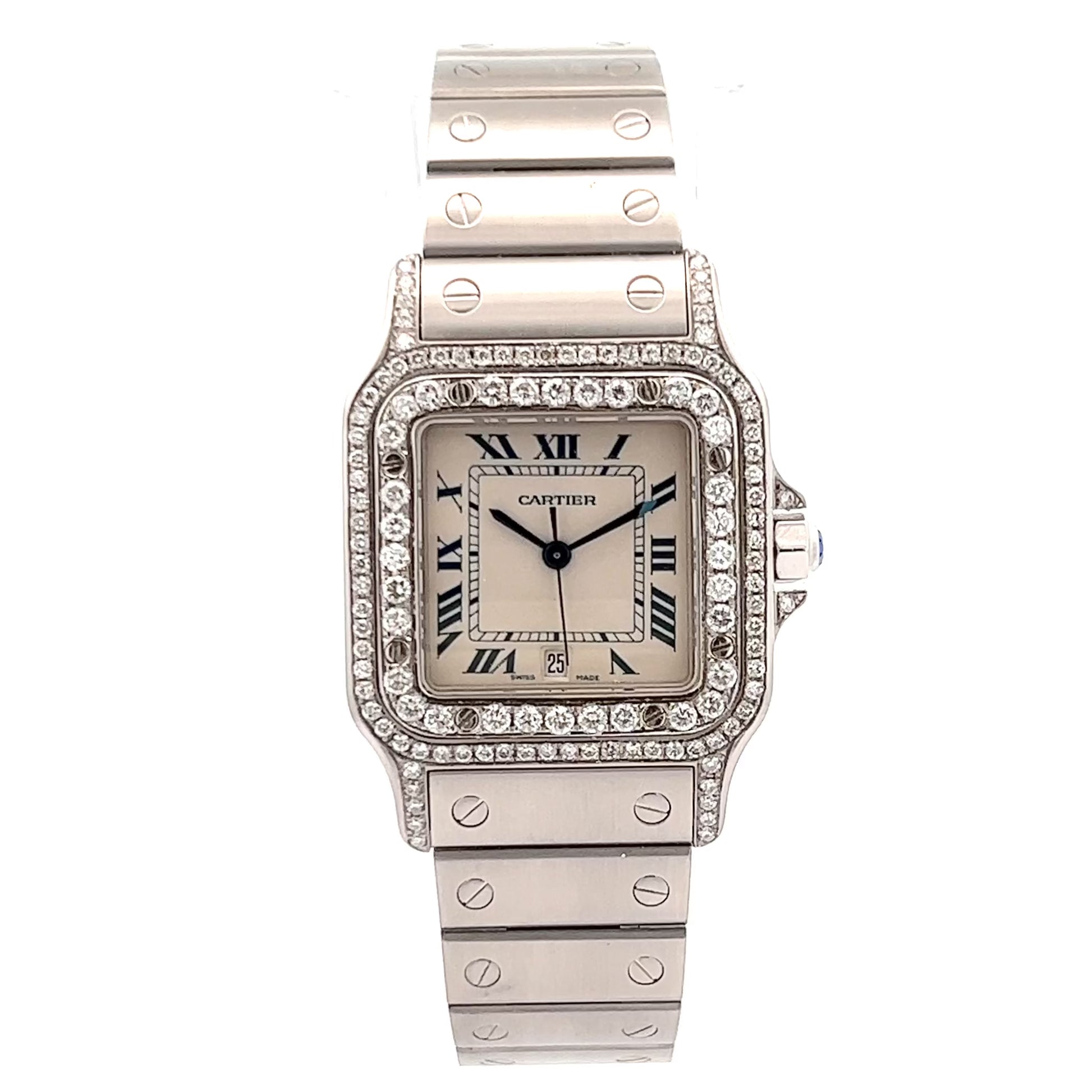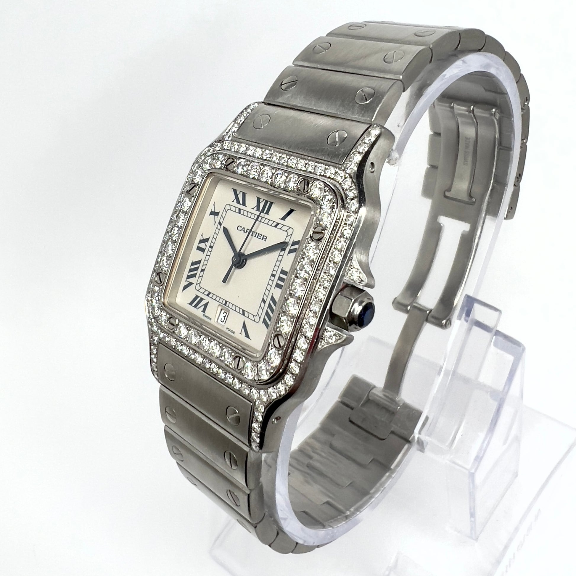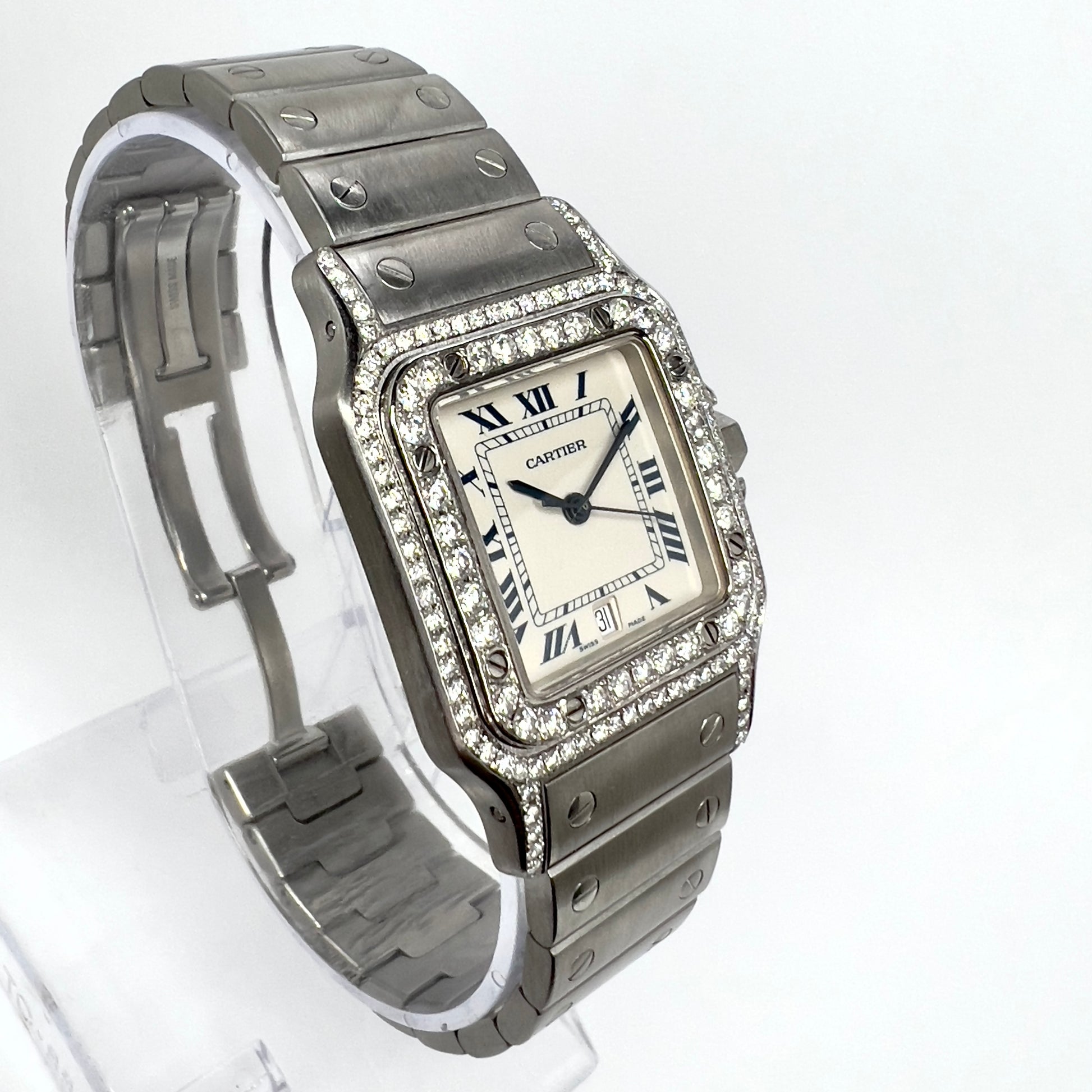 • Case: Brushed Stainless Steel set with Custom Natural Diamonds hallmarked ‘Santos de Cartier’ and stamped ‘Quartz', ‘Swiss Made’ Serial Number.
