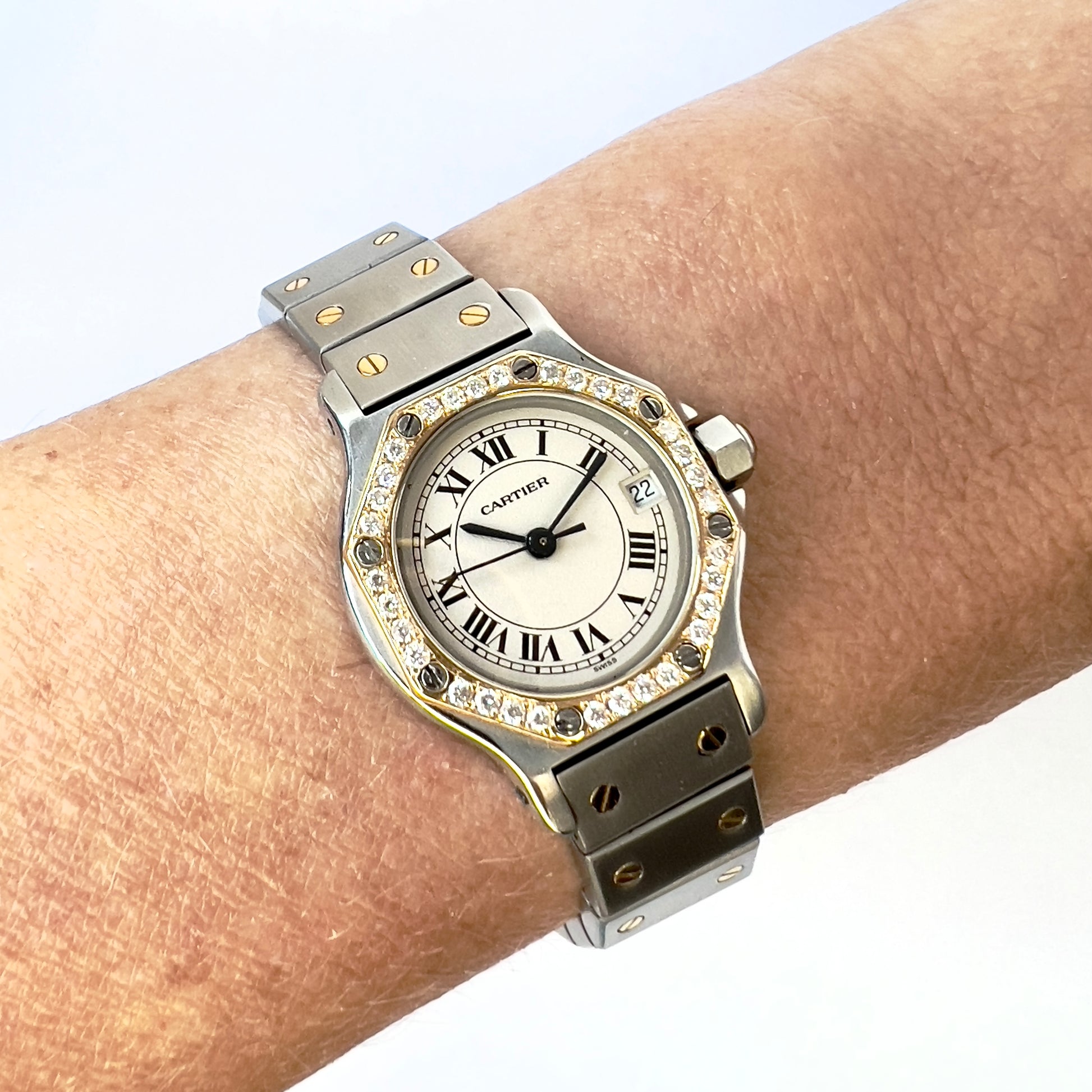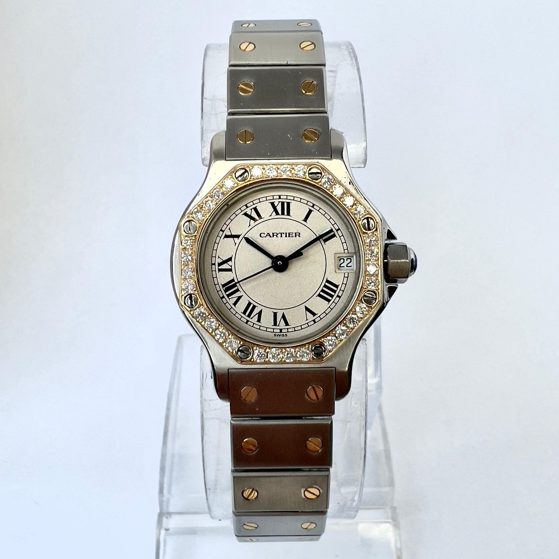 Authentic Pre Owned CARTIER SANTOS OCTAGON 25mm Quartz 2 Tone 0.40TCW Diamond Watch