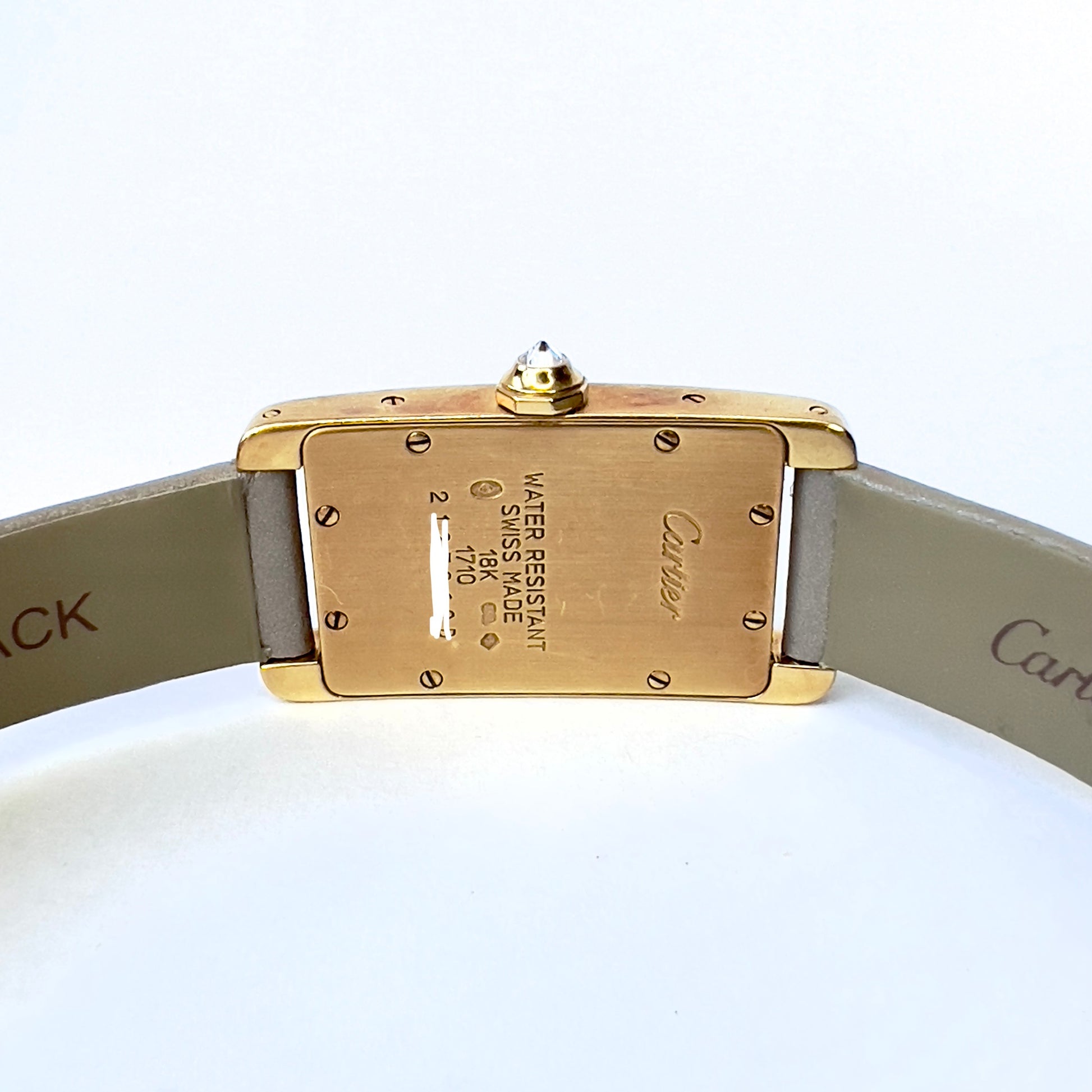 Case: Domed Glossy 18K Yell9w Gold stamped Cartier, Water Resistant, Swiss Made, 18K, 1710 and Serial Number