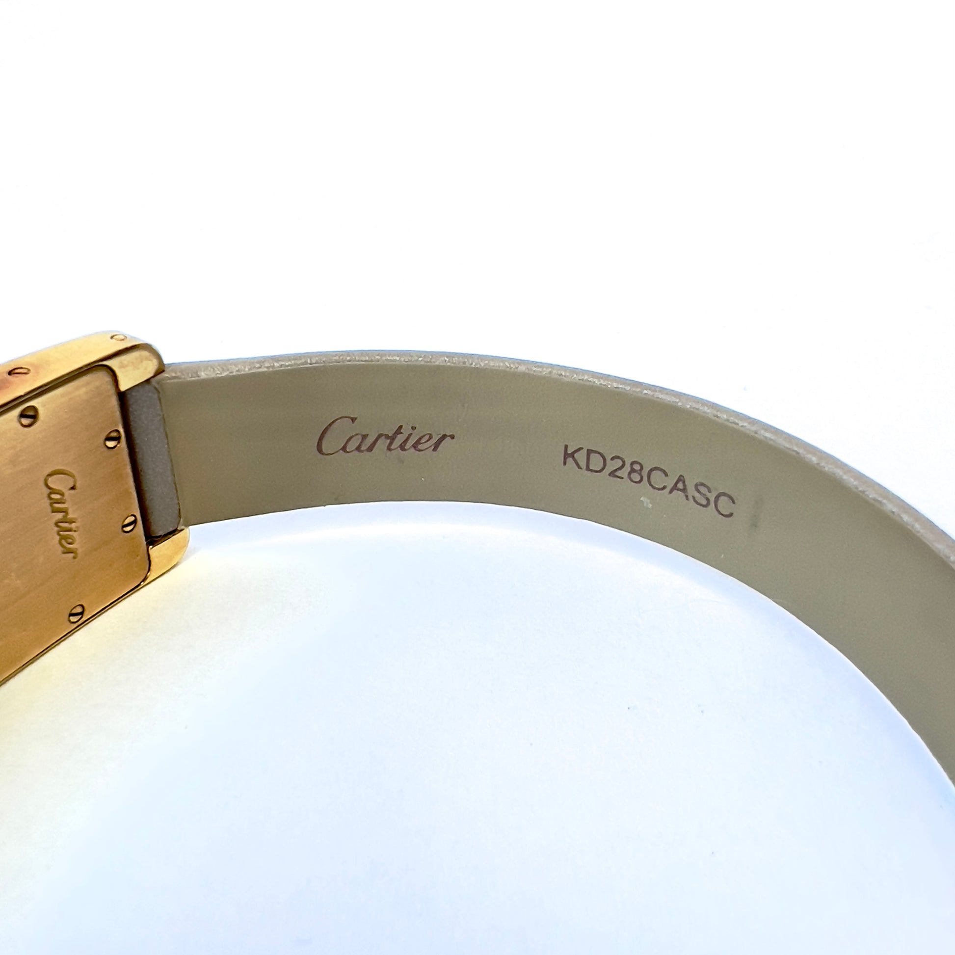 Band: Beige Genuine Leather stamped Cartier, Made in France. Fits approx. up to 6.5 inches Wrist
