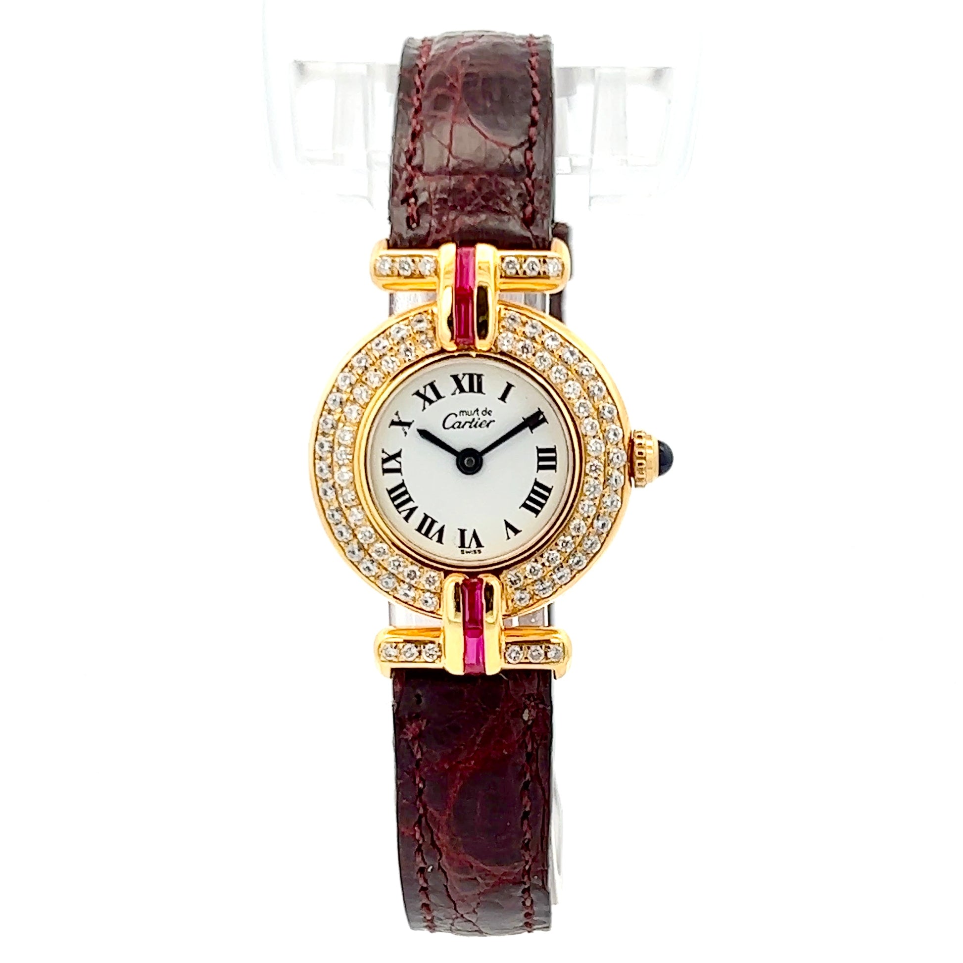 Authentic Pre Owned CARTIER VERMEIL COLISEE Quartz 24mm GP Silver 0.87TCW Diamond & Rubies White Dial Watch
