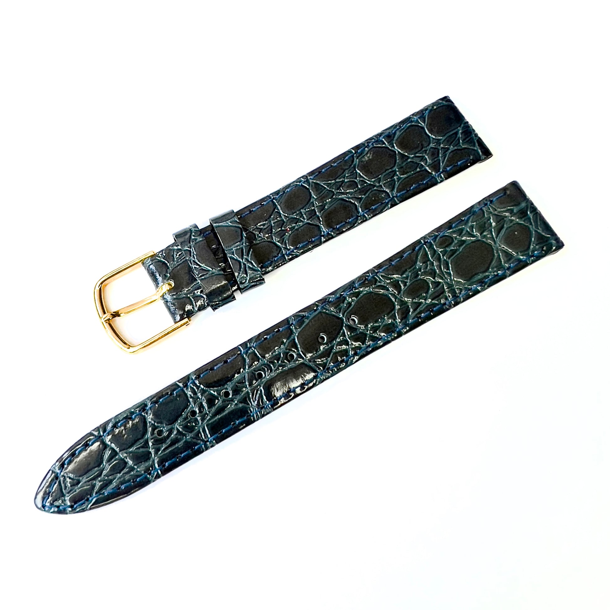 New Old Stock CHAMPION 16/15mm L Shiny Navy Blue Crocodile Calf Leather Watch Strap Band with Gold Tone Buckle