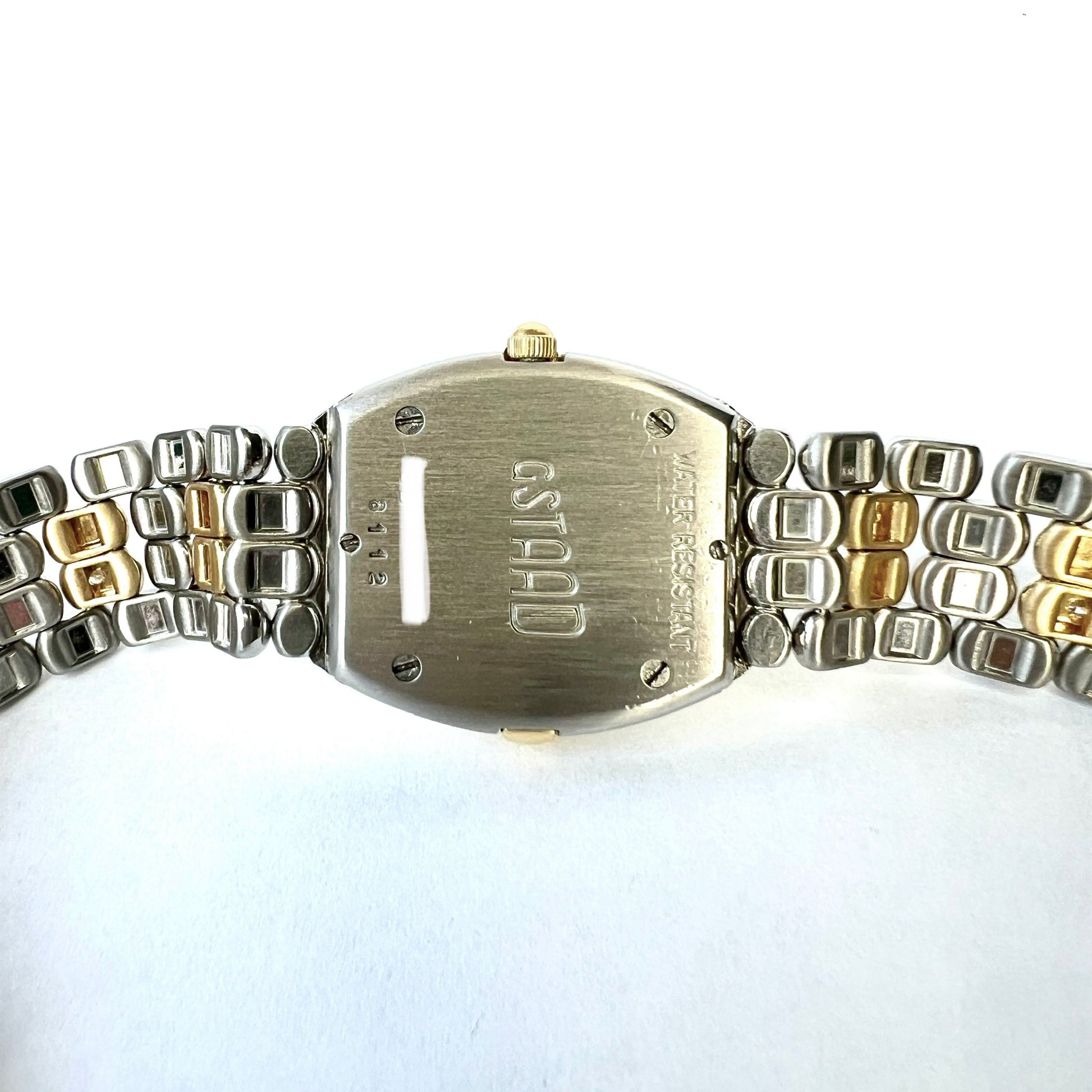 Case: Glossy Stainless Steel stamped ‘Water Resistant', 'GSTAAD', ‘8112’ and Serial Number