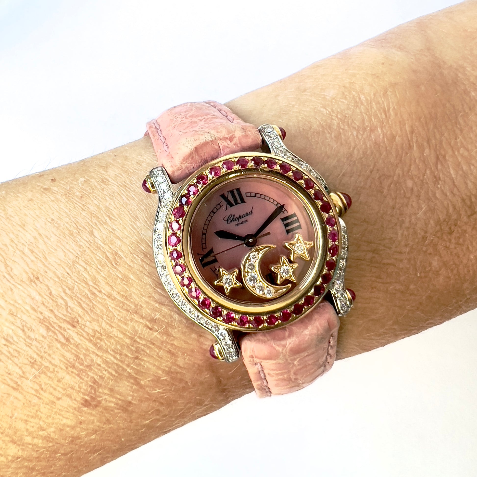 Dial: Pink Mother Of Pearl stamped Chopard, Geneve, Swiss Made. Floating Factory Diamonds in Star and Moon shapes framed in Gold.