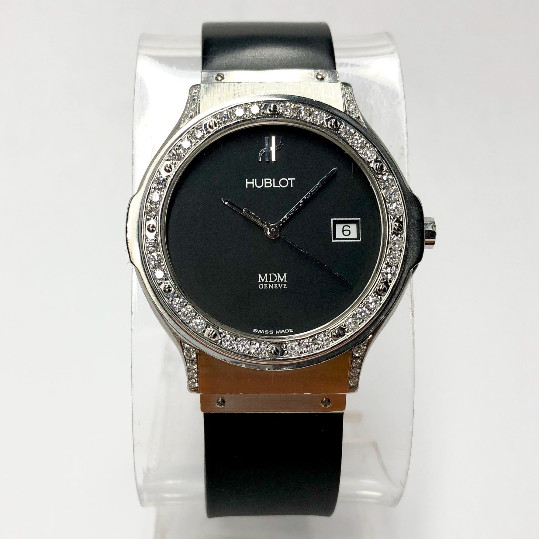Case: Glossy Stainless Steel Set with Diamonds and stamped 'HUBLOT', 'MDM Geneve', 'Modele Depose', 'Wat. Res. 5ATM', 1523 and Serial Number.