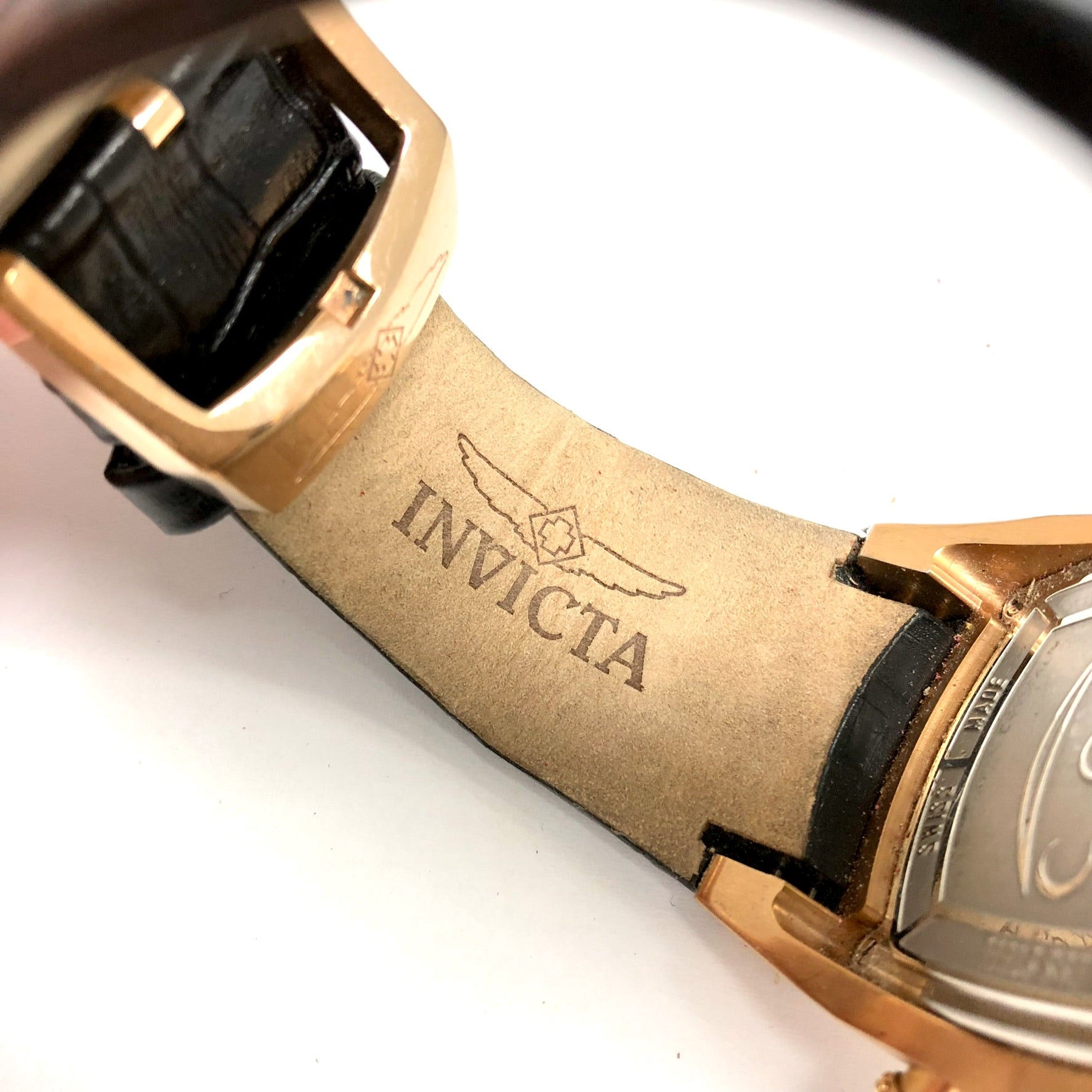 Band: Original. Black stitched Leather stamped Genuine Leather, Invicta. Fits approx. 6.5-9 Inches wrist.