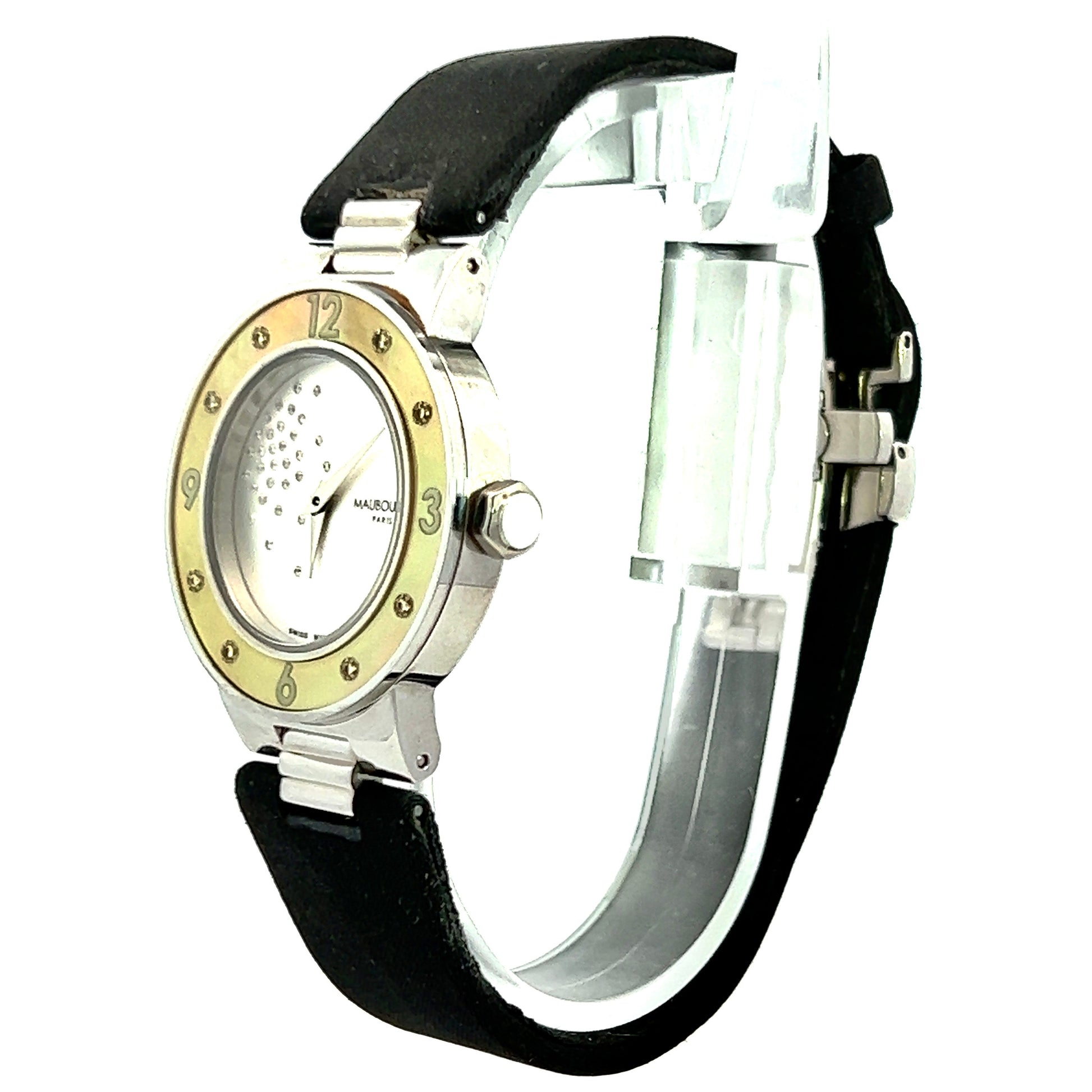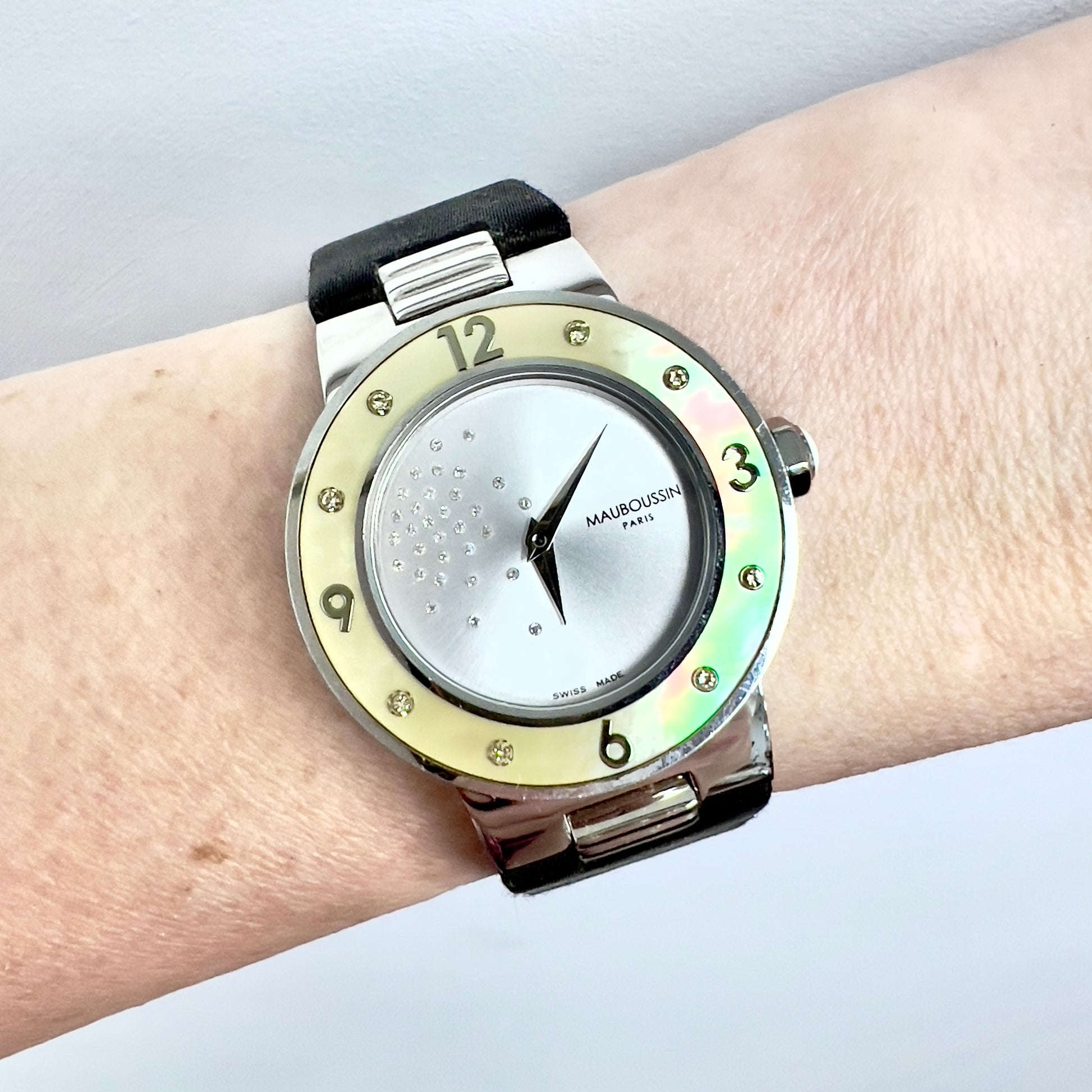 Dial: Silver Color set with Factory Diamonds stamped Mauboussin, PARIS, Swiss Made