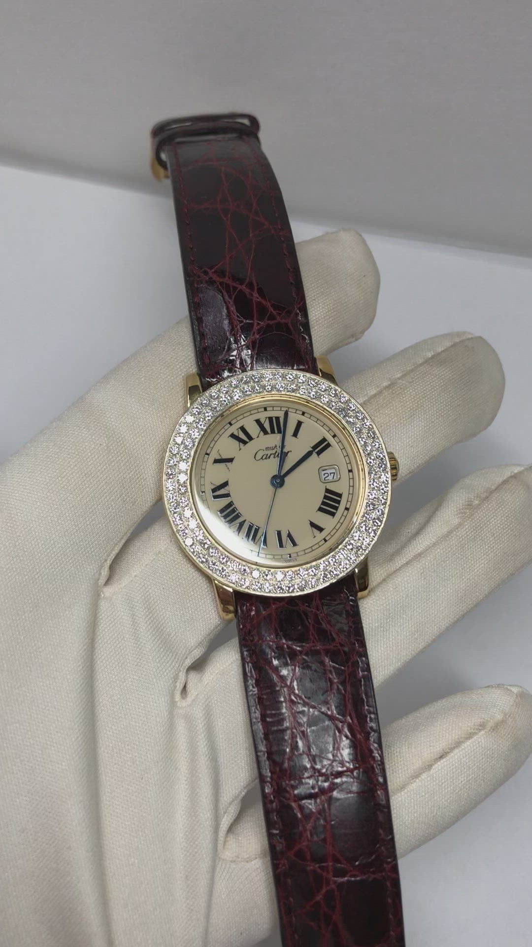 Band: Burgundy Genuine Leather stamped Cartier. Fits approx. 6.5-9 inches wrist