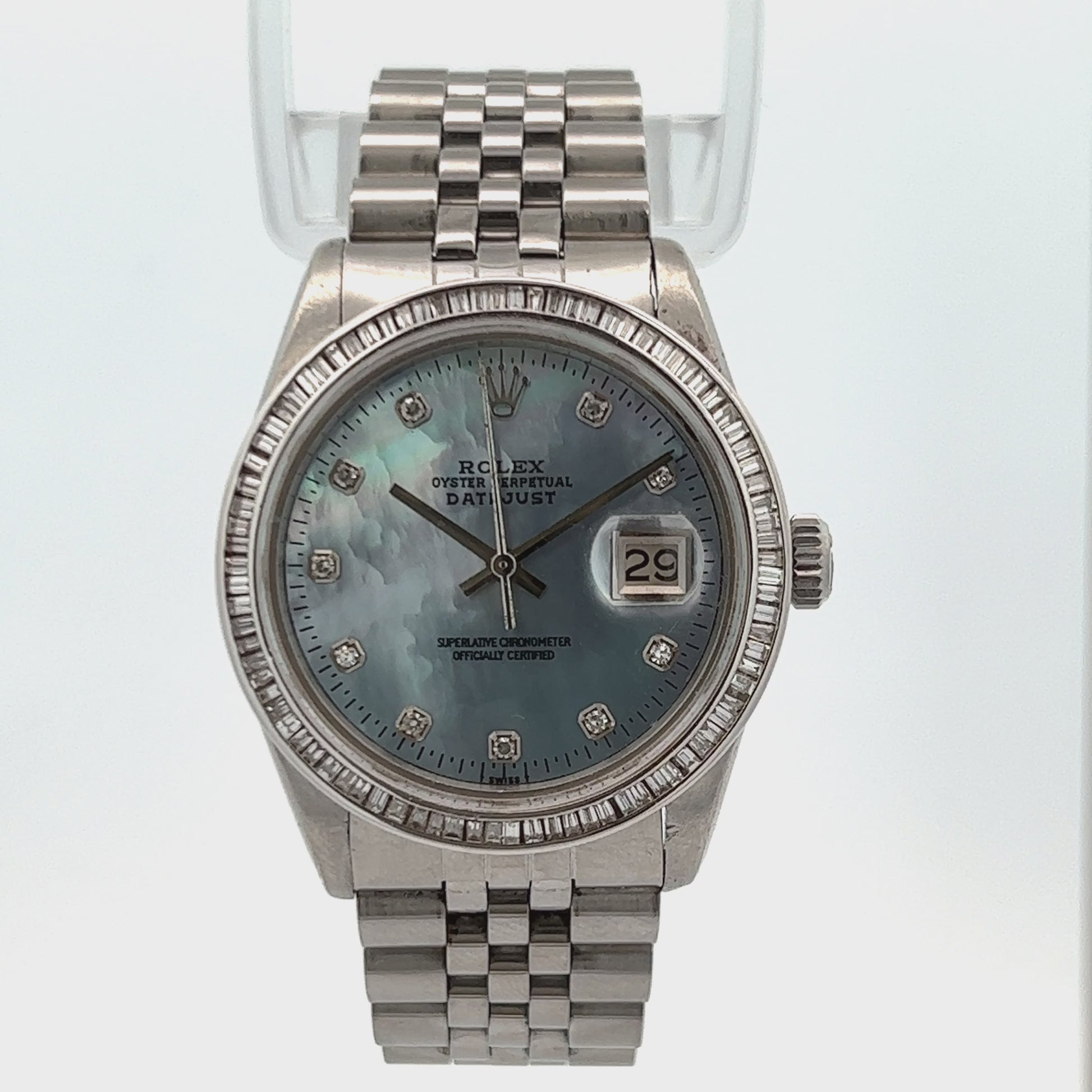 Dial: Aftermarket. Blue Mother of Pearl set with Diamonds hallmarked ROLEX, 'Oyster Perpetual', ‘Datejust’, ‘Superlative Chronometer’, ‘Officially Certified’, ‘Swiss’