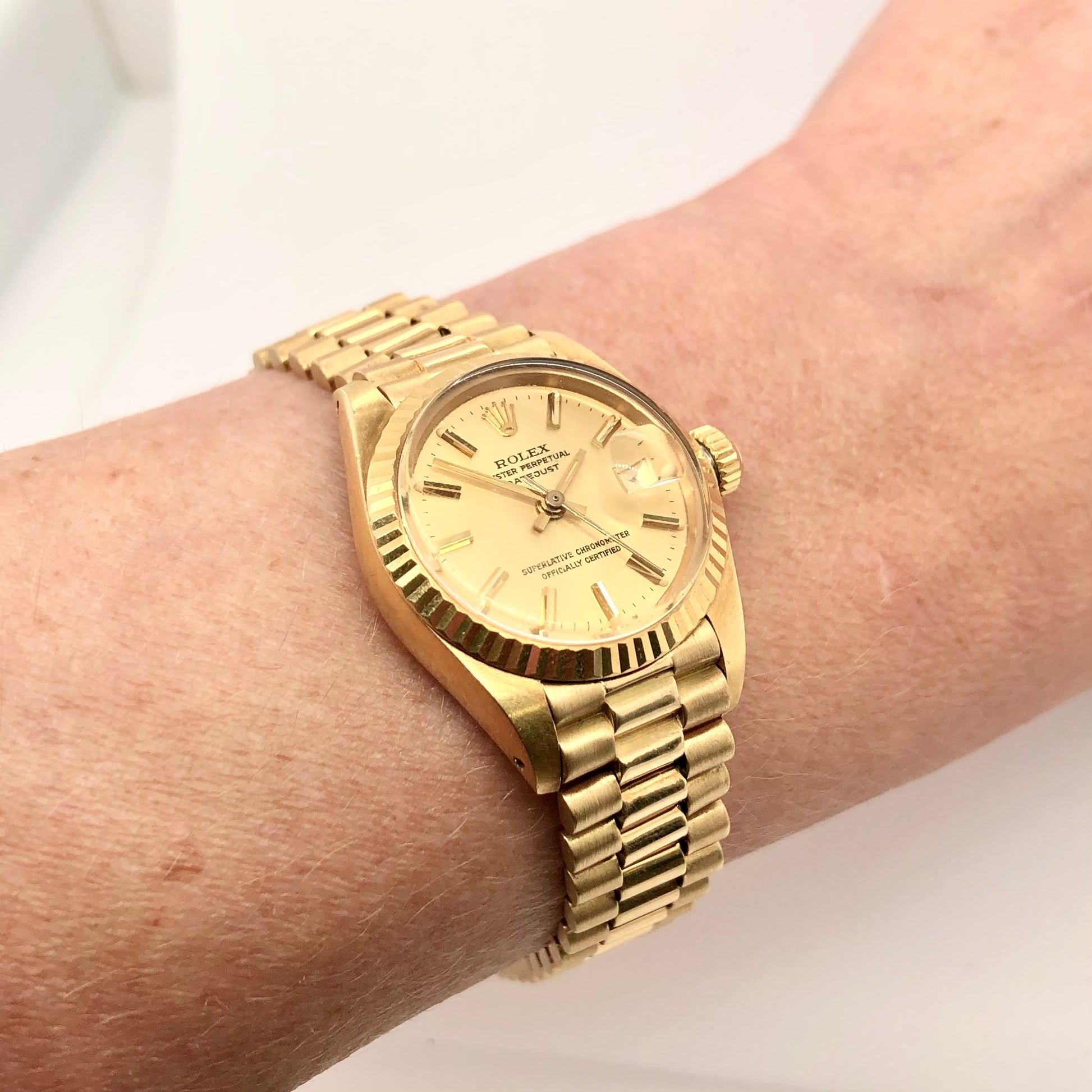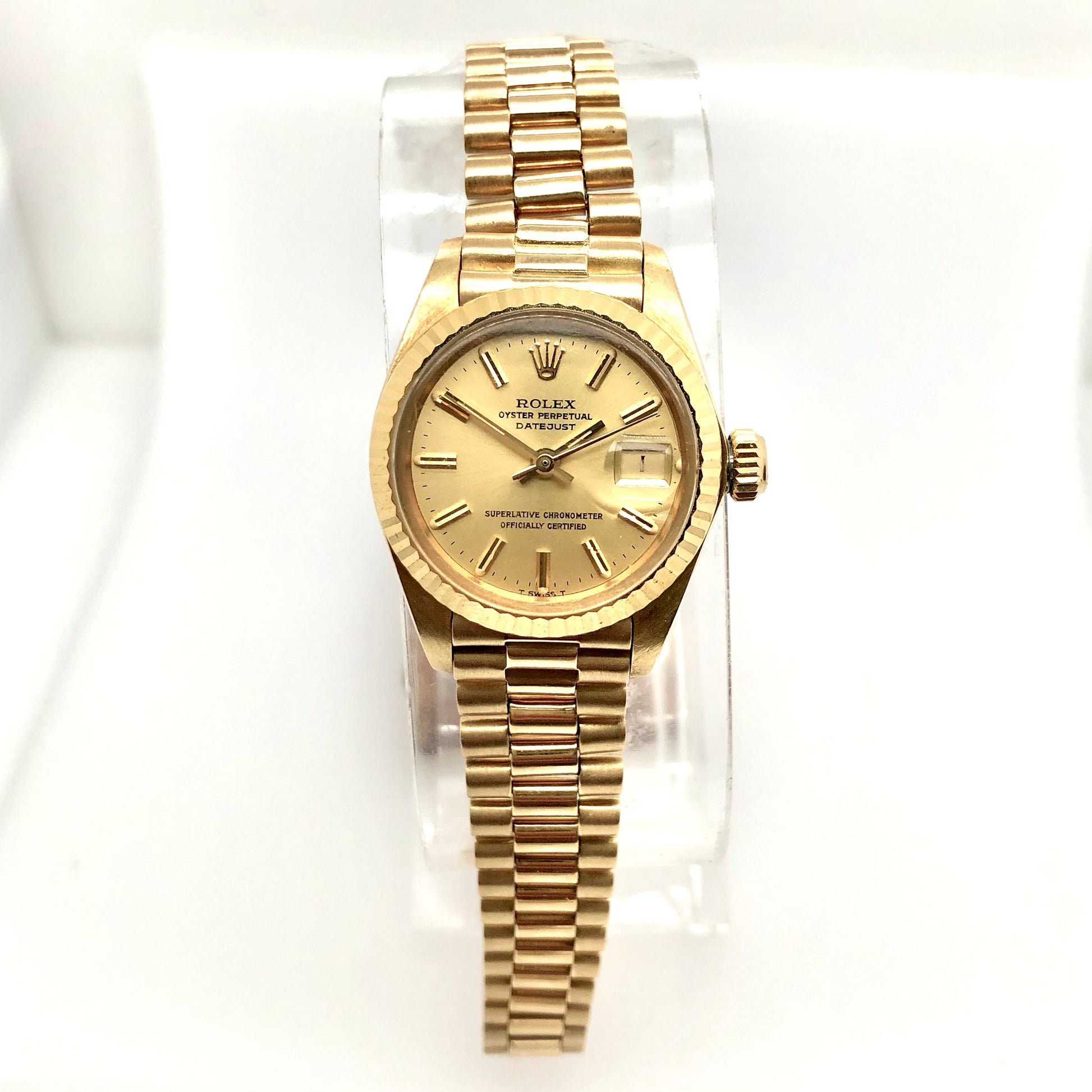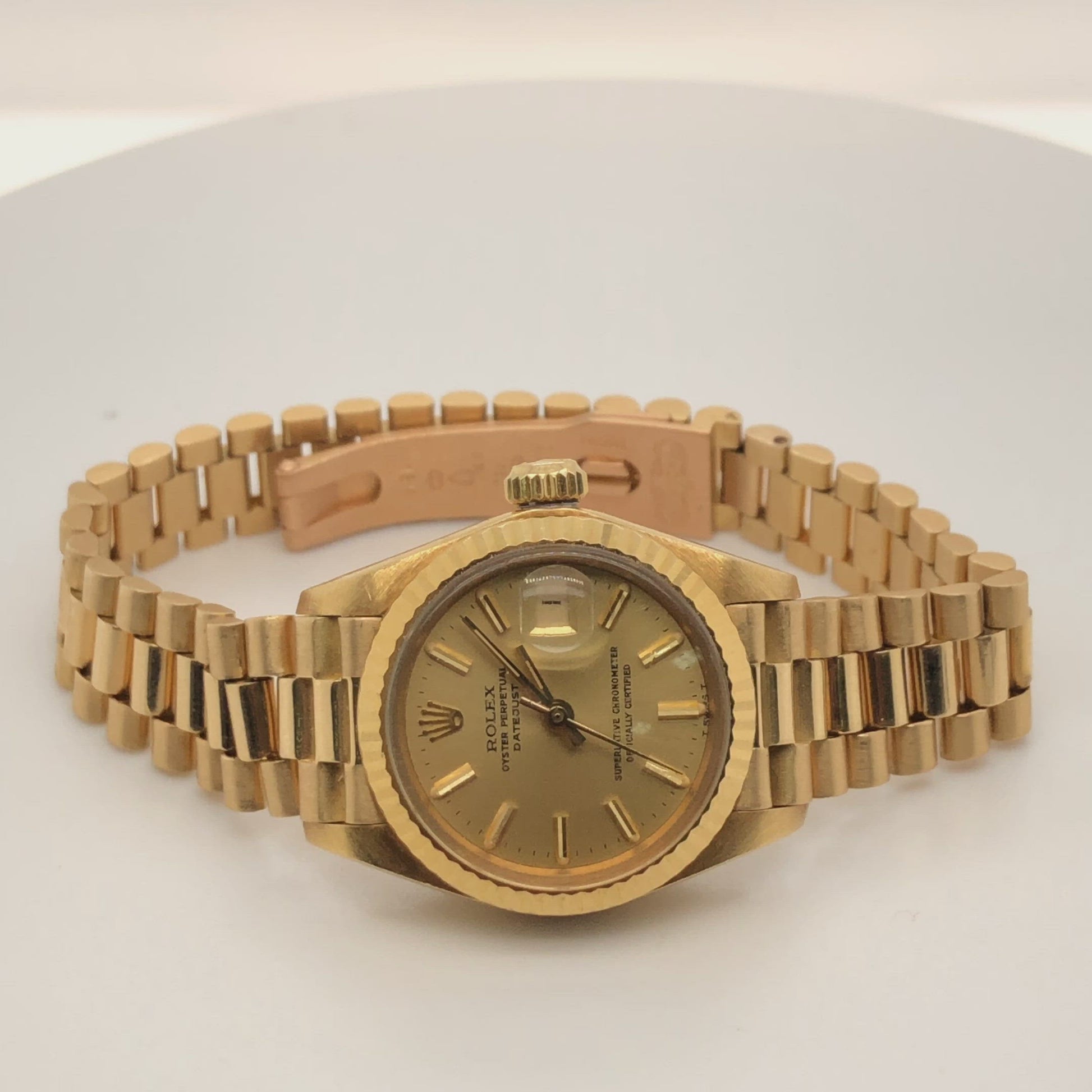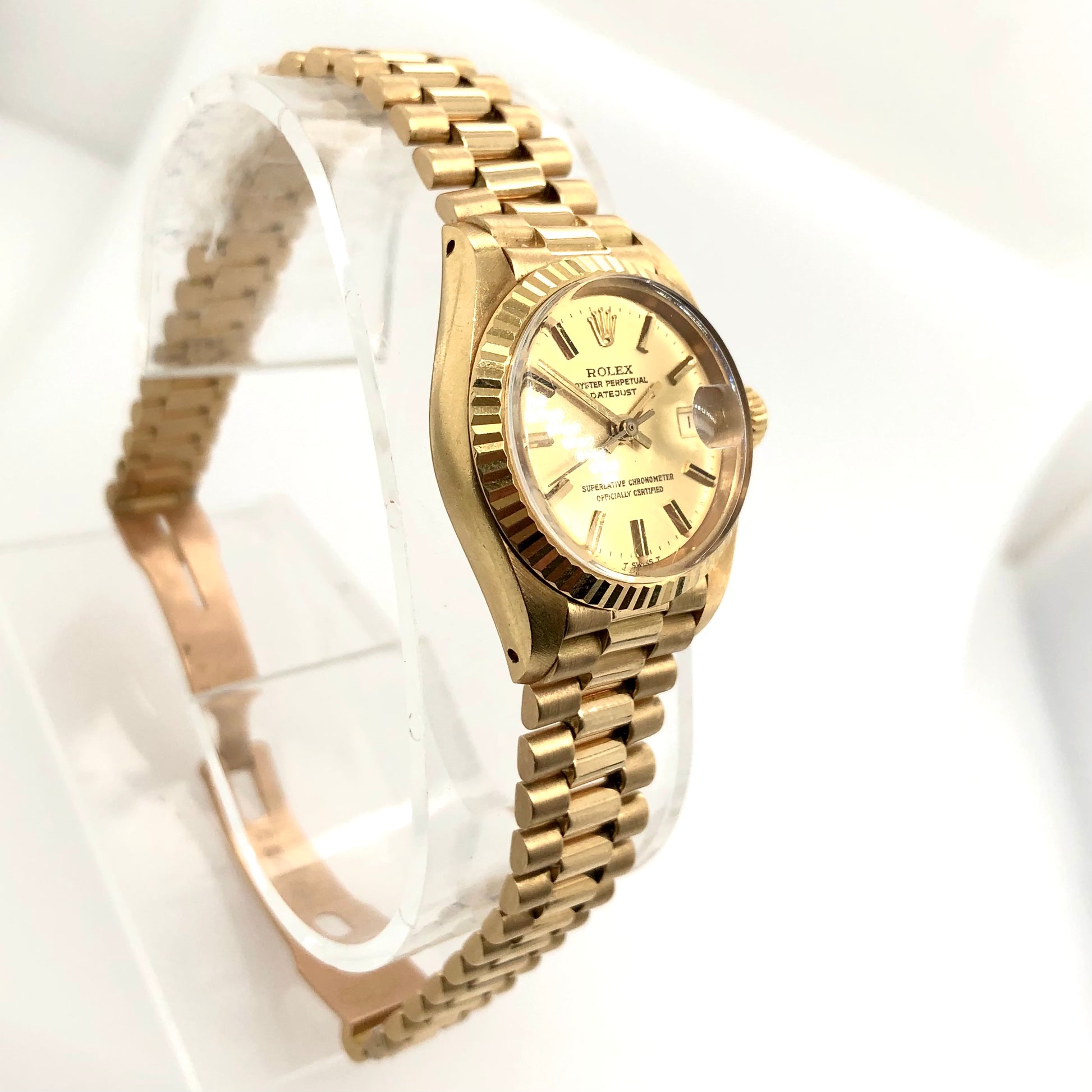 Dial: Yellow Gold Color hallmarked ROLEX, 'Oyster Perpetual’ ‘Datejust’, ‘Superlative Chronometer’, ‘Officially Certified', 'T Swiss Made T’