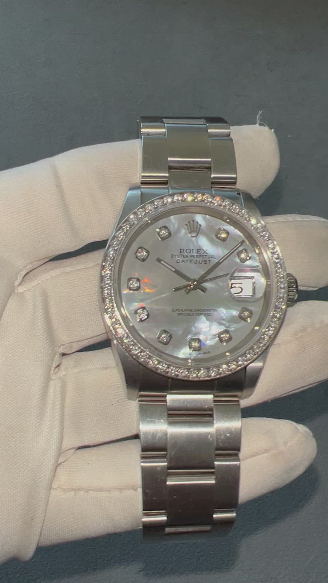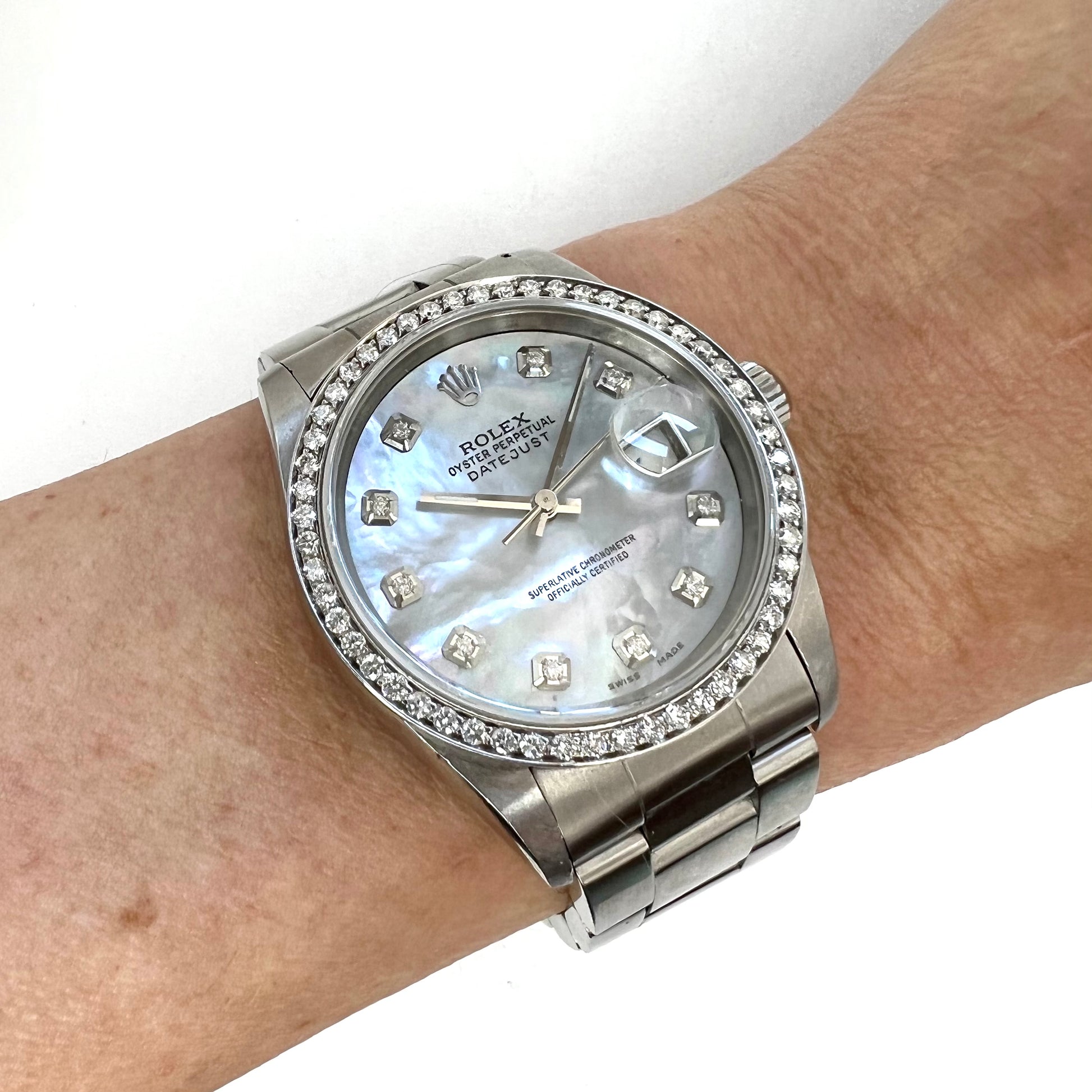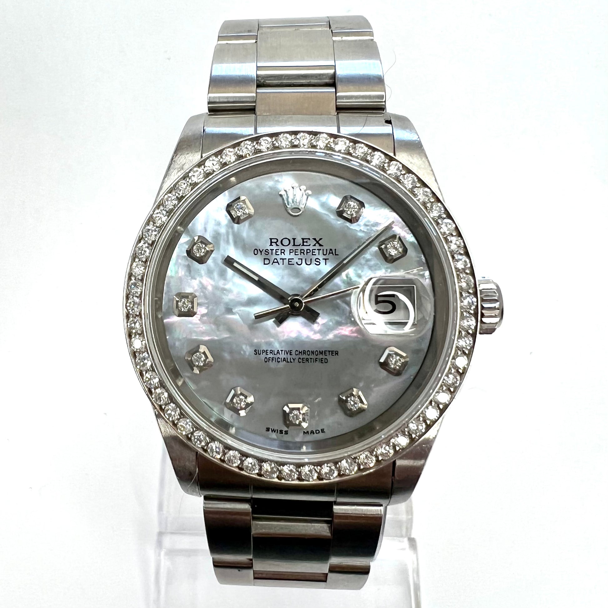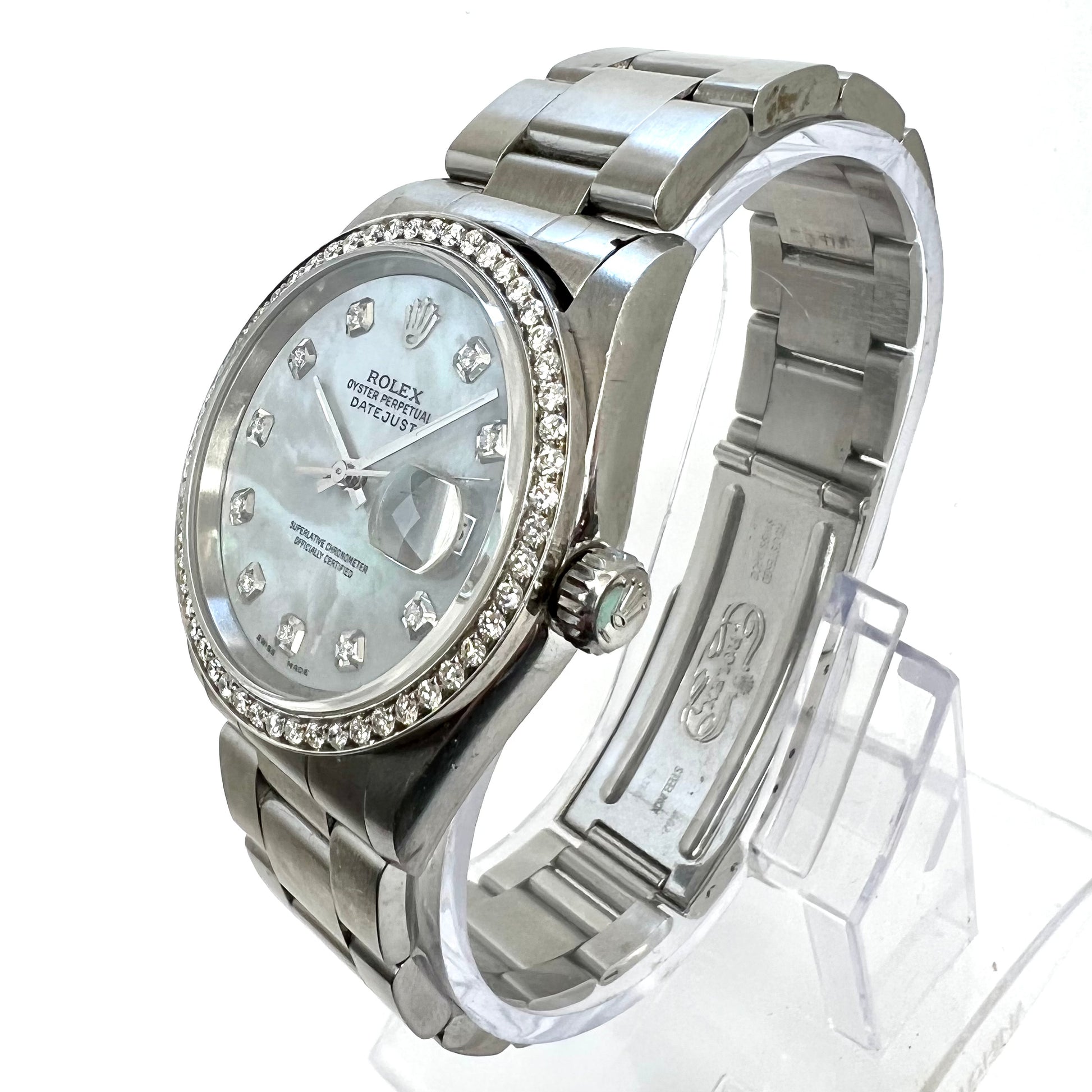 Dial: Aftermarket. White MOP set with Diamonds hallmarked ROLEX, 'Oyster Perpetual', ‘Datejust’, ‘Superlative Chronometer’, ‘Officially Certified’, 'Swiss Made’.
