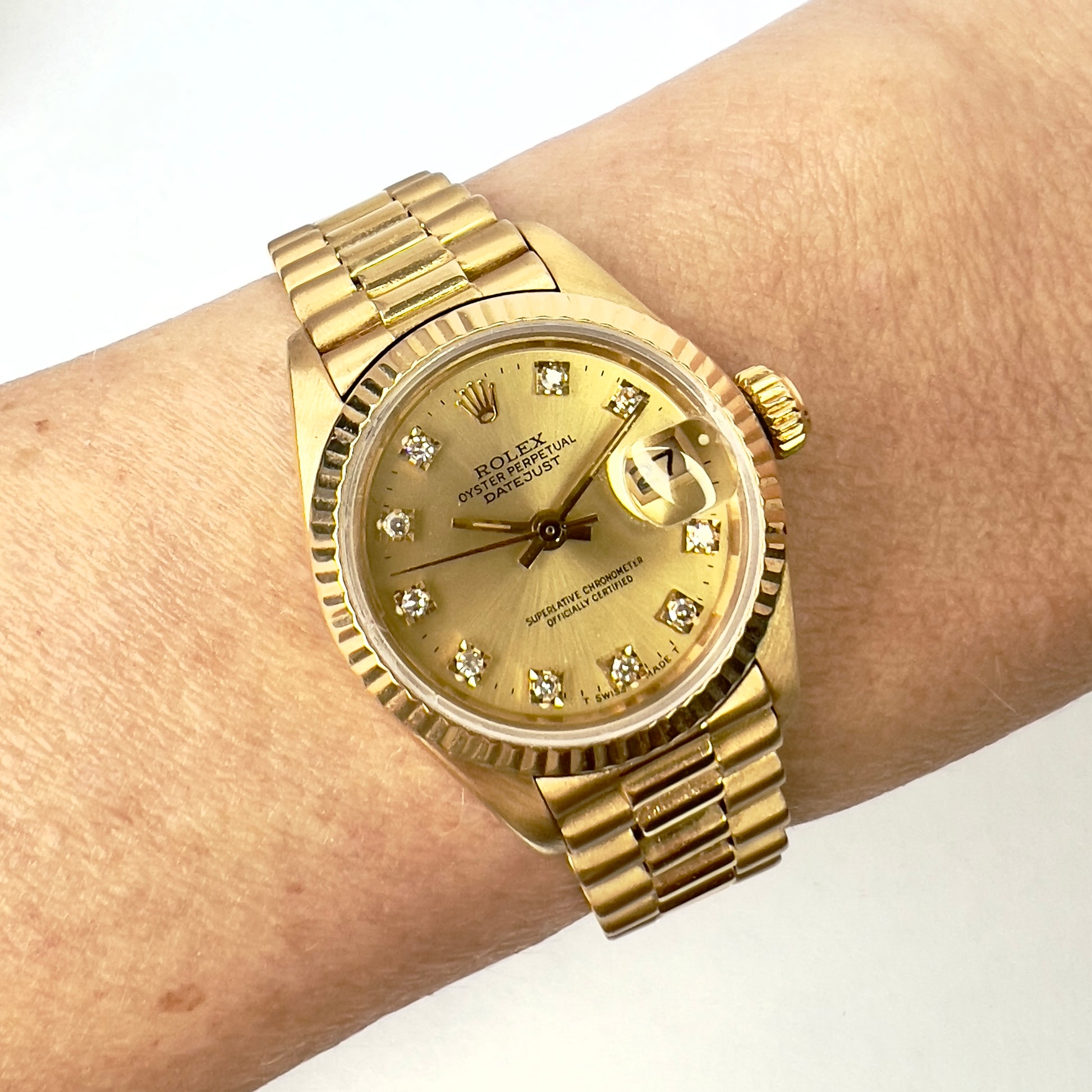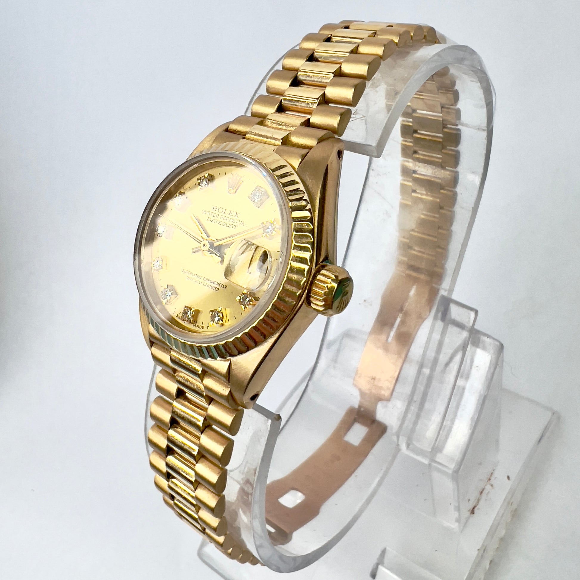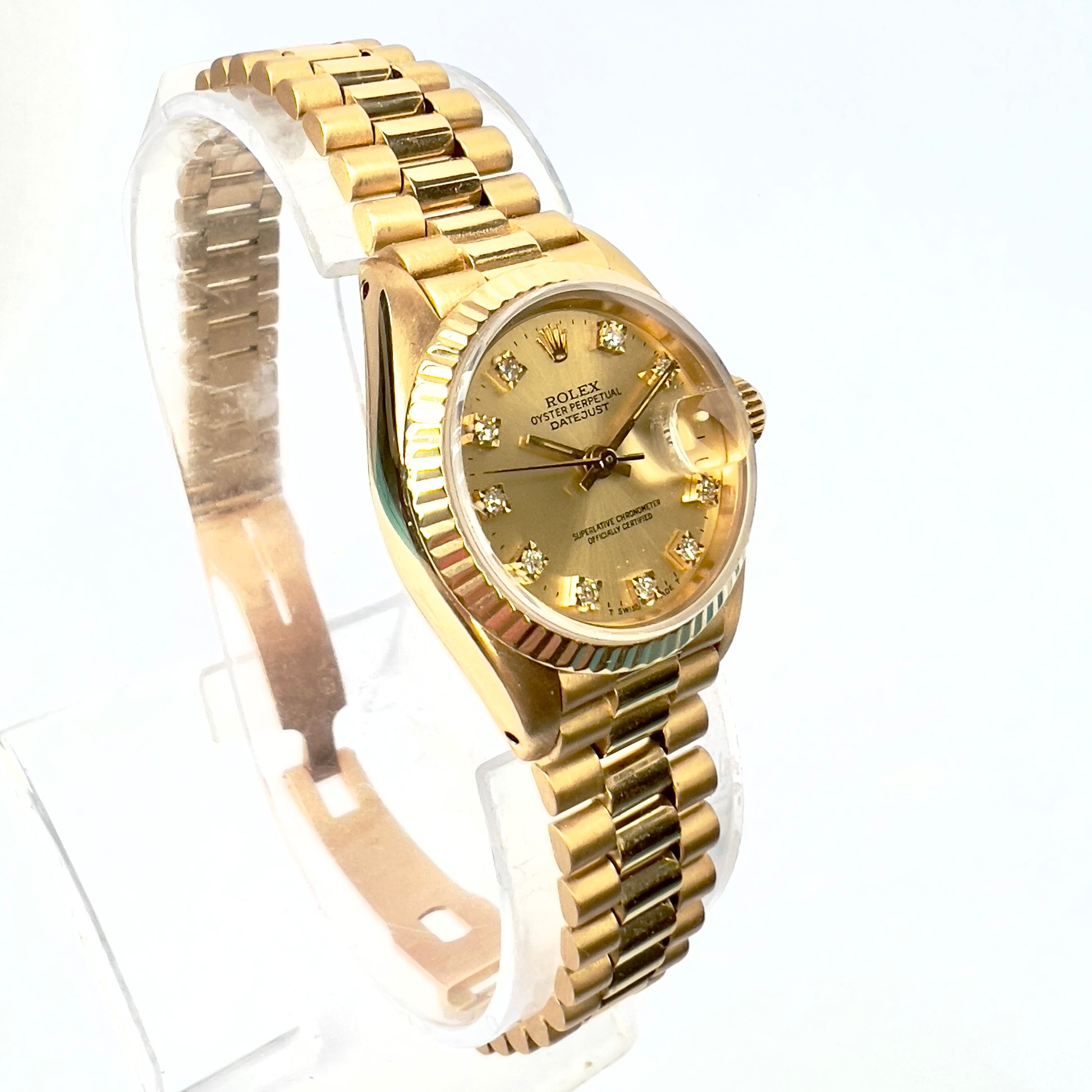 Dial: Aftermarket Dial. Yellow Gold Color set with Diamonds and hallmarked ROLEX, 'Oyster Perpetual’ ‘Datejust’, ‘Superlative Chronometer’, ‘Officially Certified', 'T Swiss Made T’.