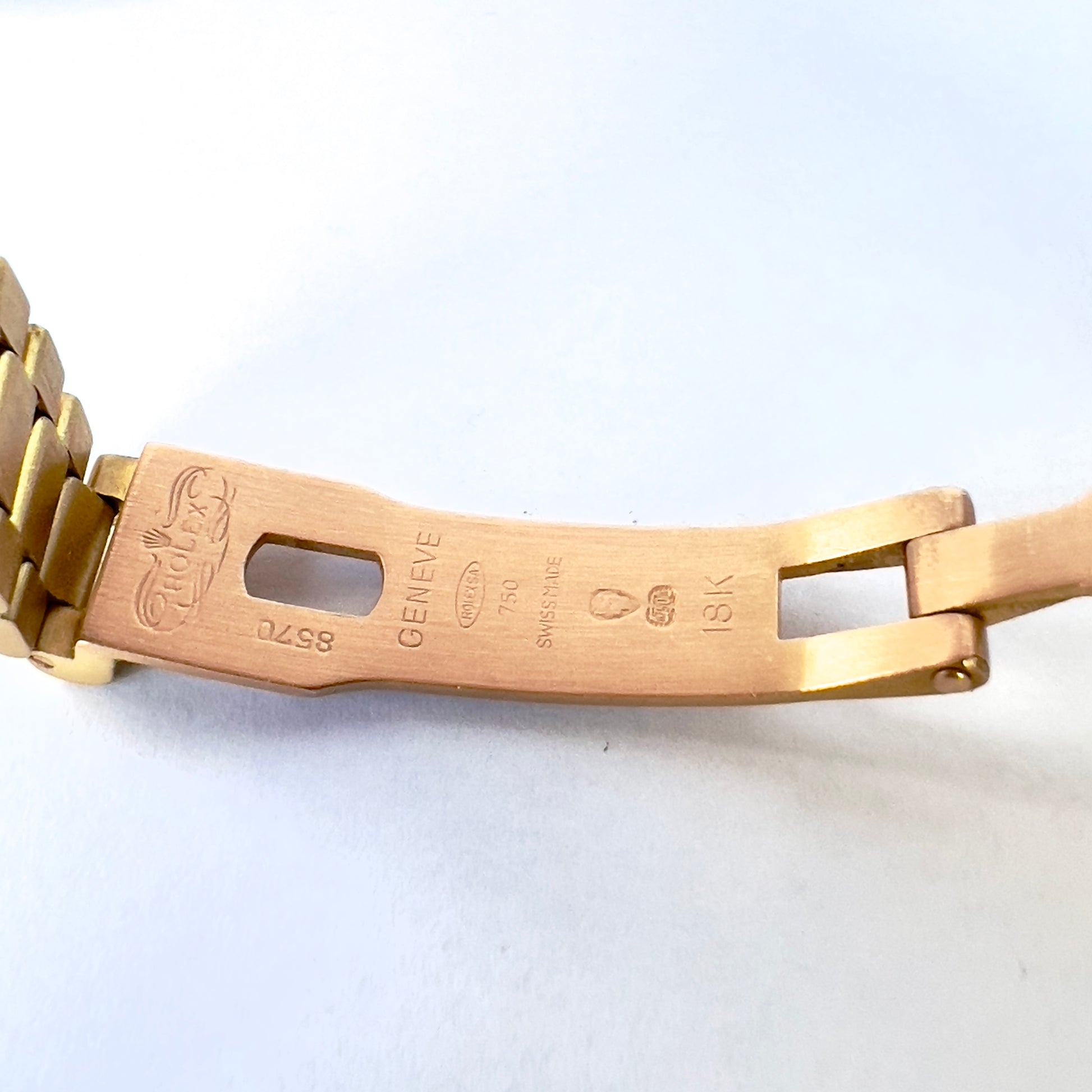 Clasp: 18K Yellow Gold Fold with Logo and stamped 'Swiss Made', 'Genève’, ‘Rolex', '18K’, ‘750’.