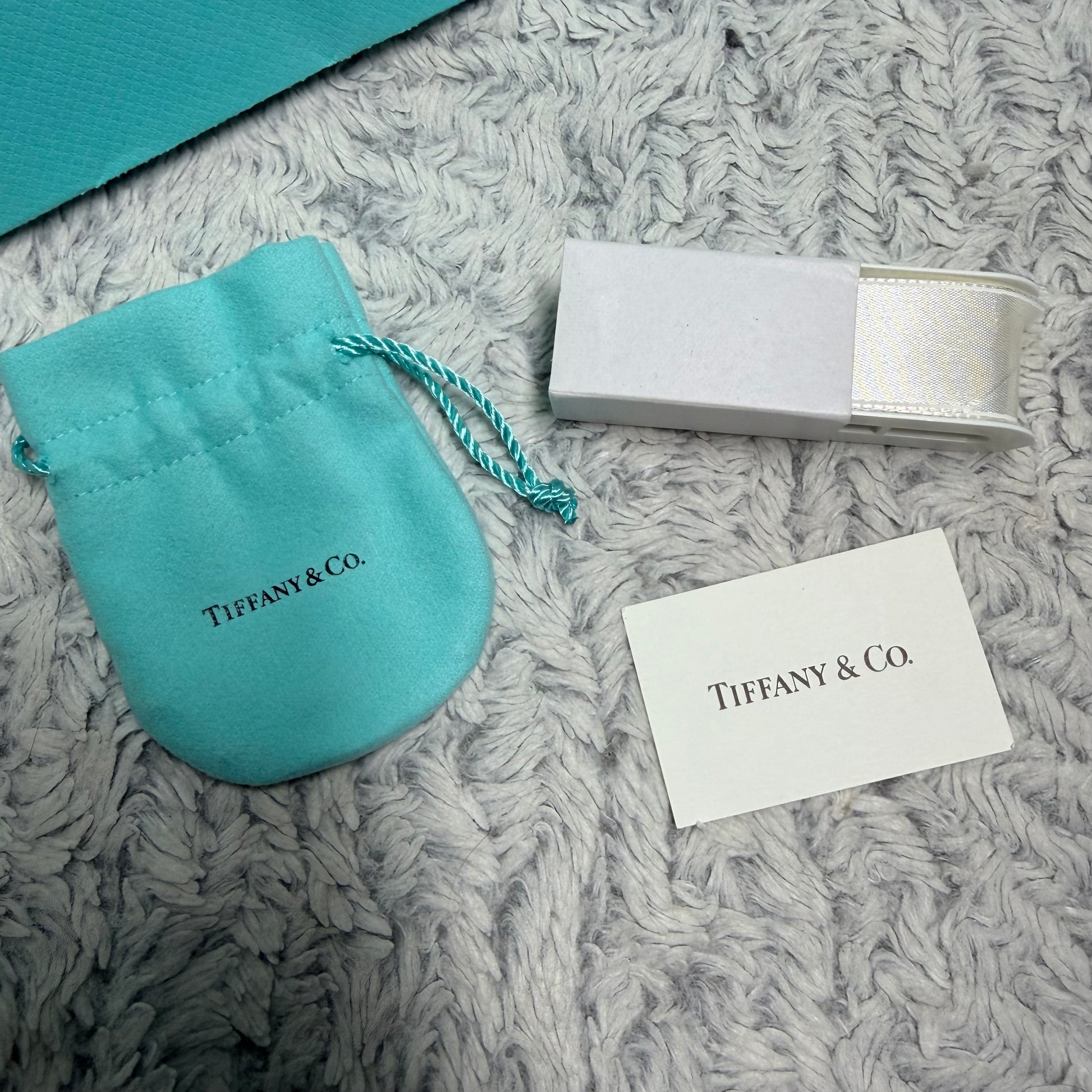Authentic TIFFANY & CO. Jewerly Pouch 3.75x2.80” + Box 3.75x3x1.40” + NEW Original Ribbon + Card + Shopping Bag 9.75x8x4”